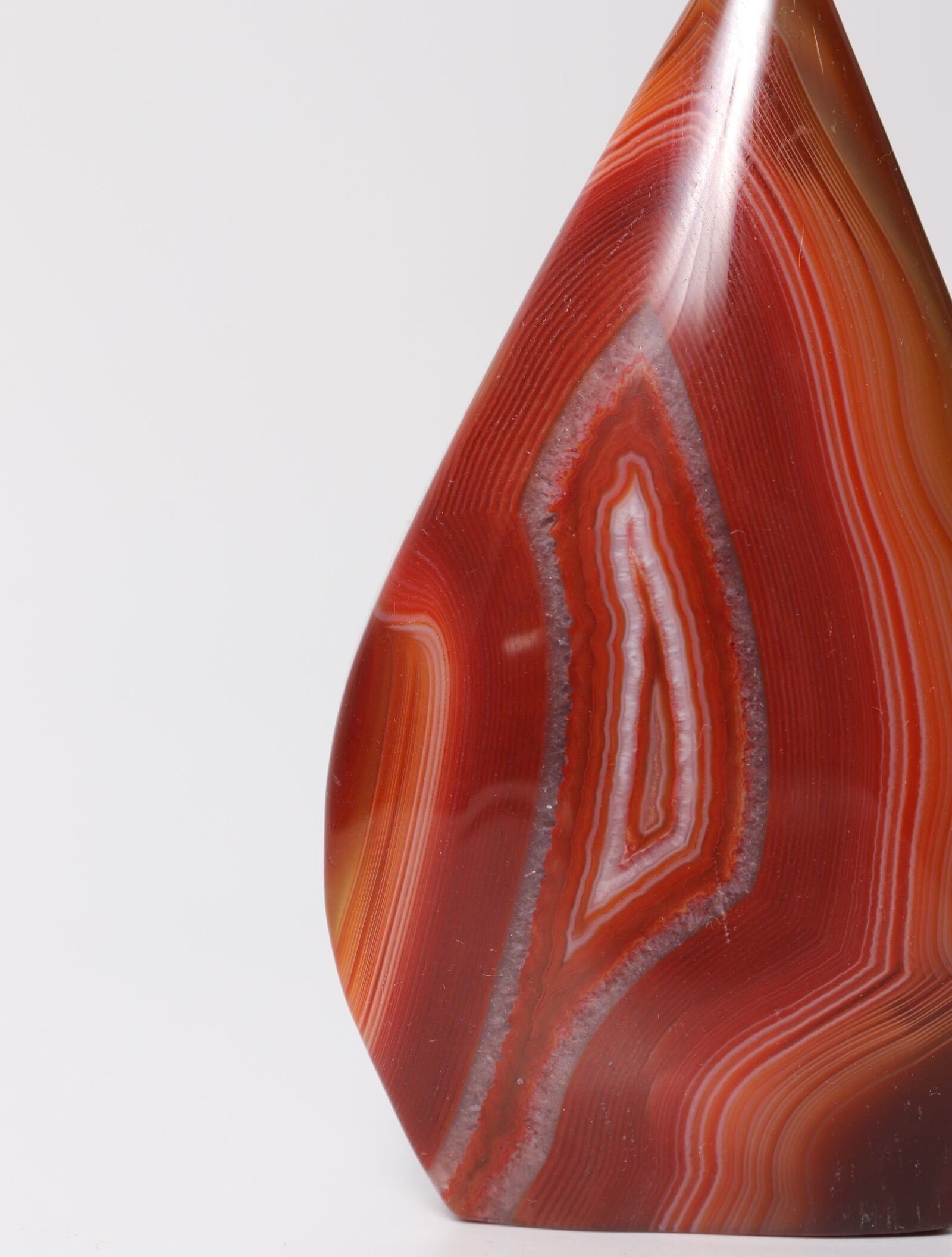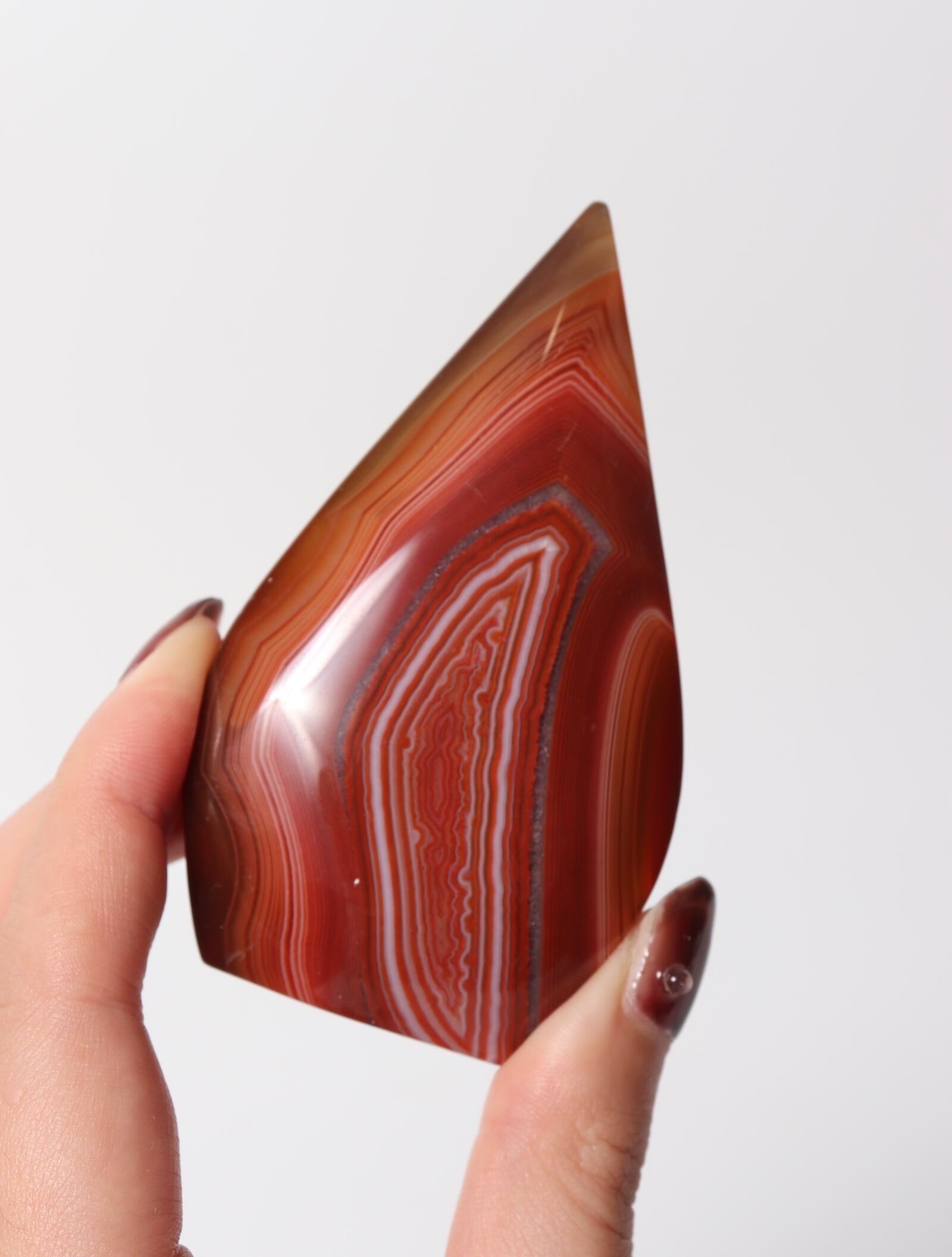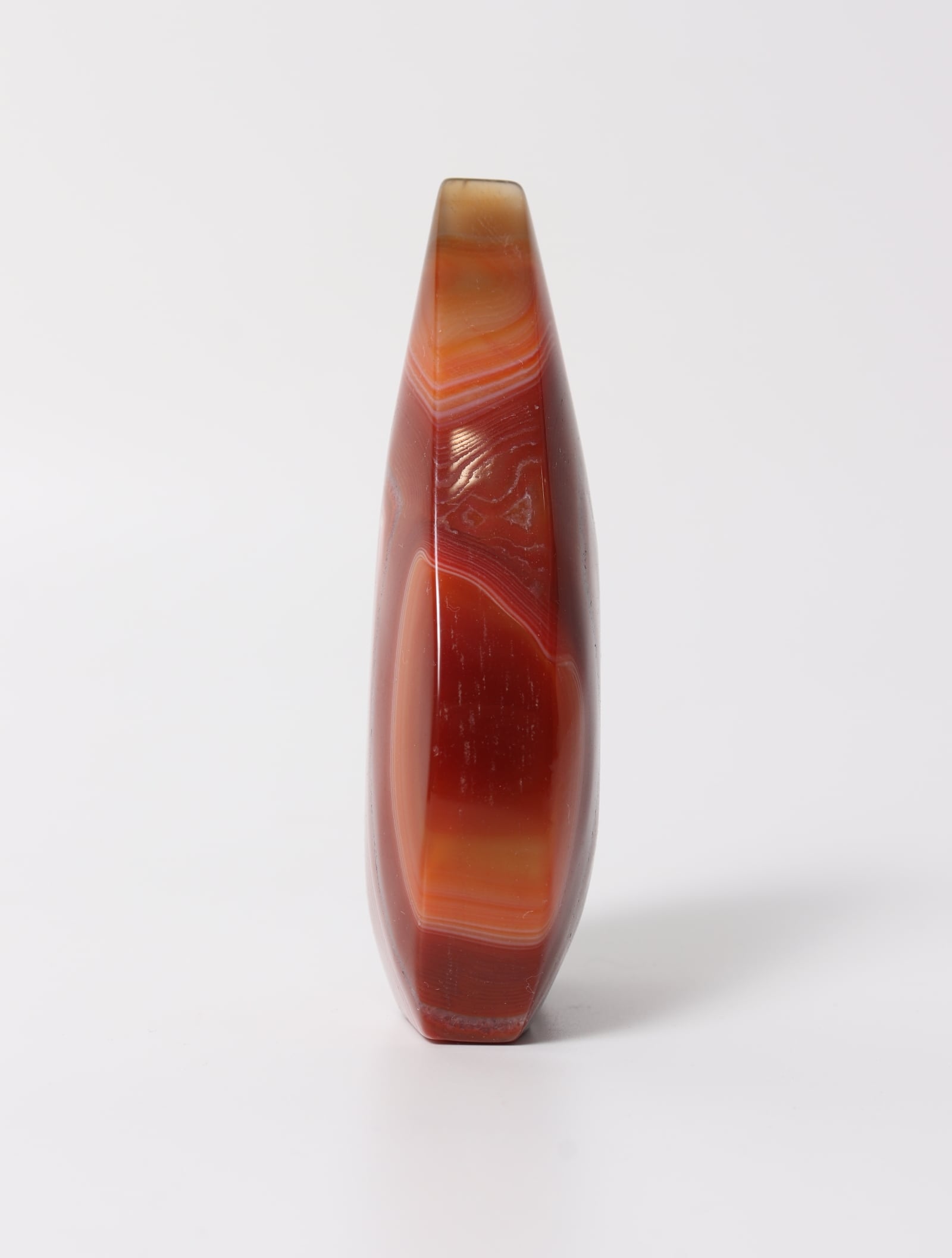 温かみのある色合いと非常に細かく柔らかい雰囲気を持つ縞模様が人気を呼び、カーネリアアゲートはジュエリーやアクセサリーとしてもよく用じられている天然石。