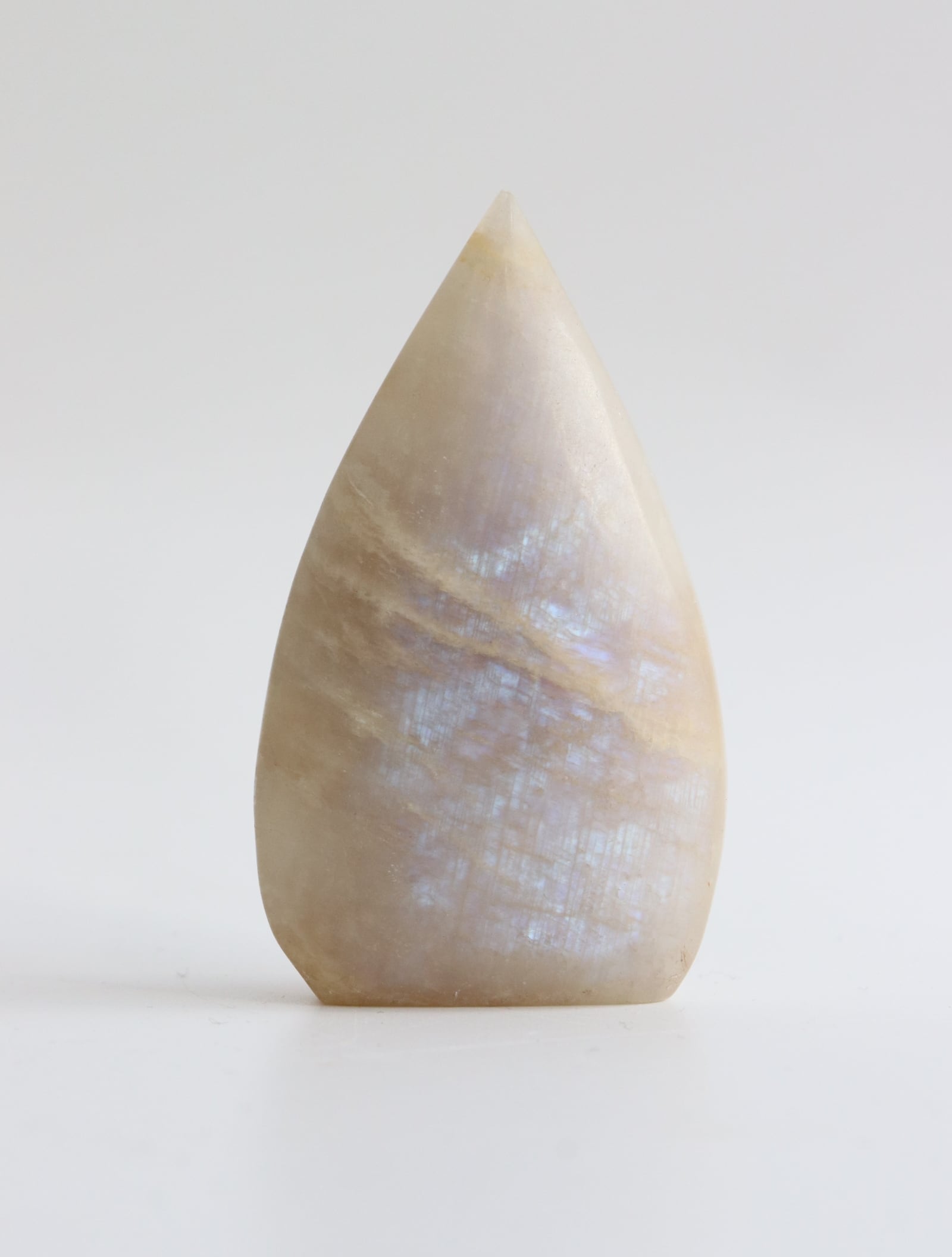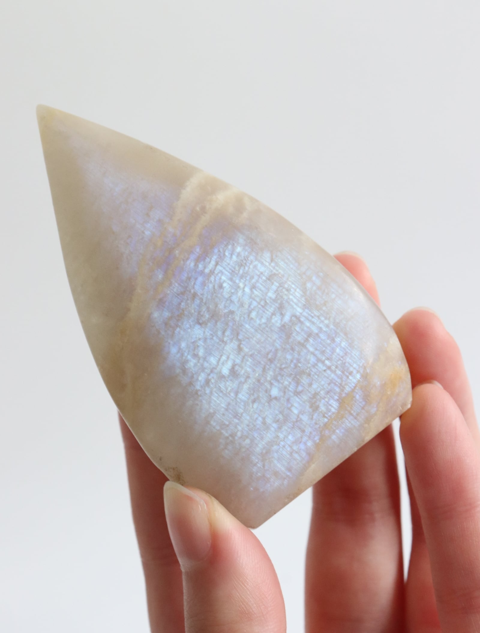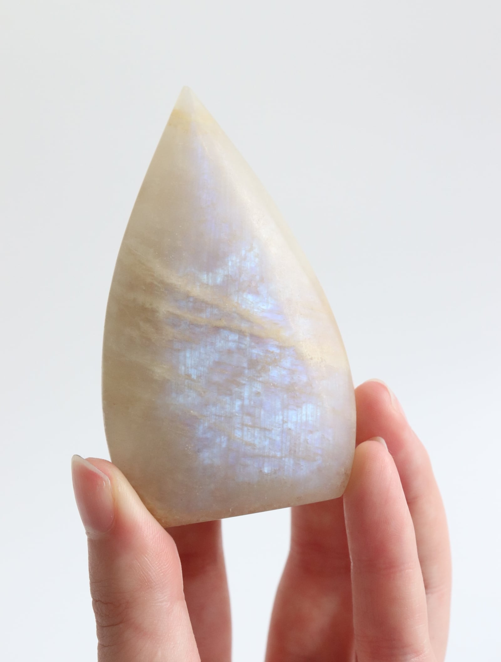 優しく浮かび上がる青い光が、心の奥深くまでそっと染み込むように照らし、神秘的で静寂に満ちた月夜を思わせるブルームーンストーン。この幻想的な青い輝きは、石の内部構造によって光が干渉し合うことで生まれ、光の角度によって色が変化する「ブルーシラー」として現れます。