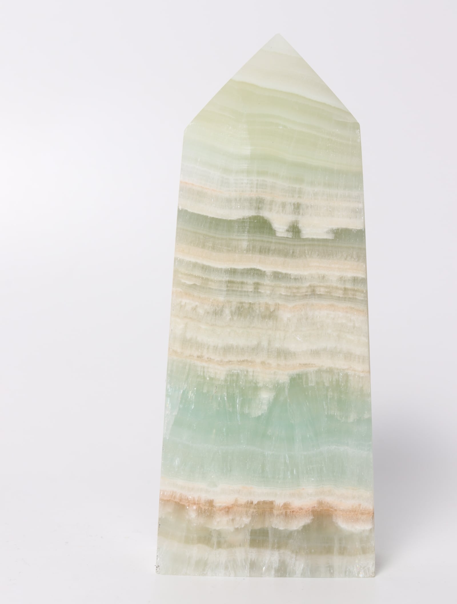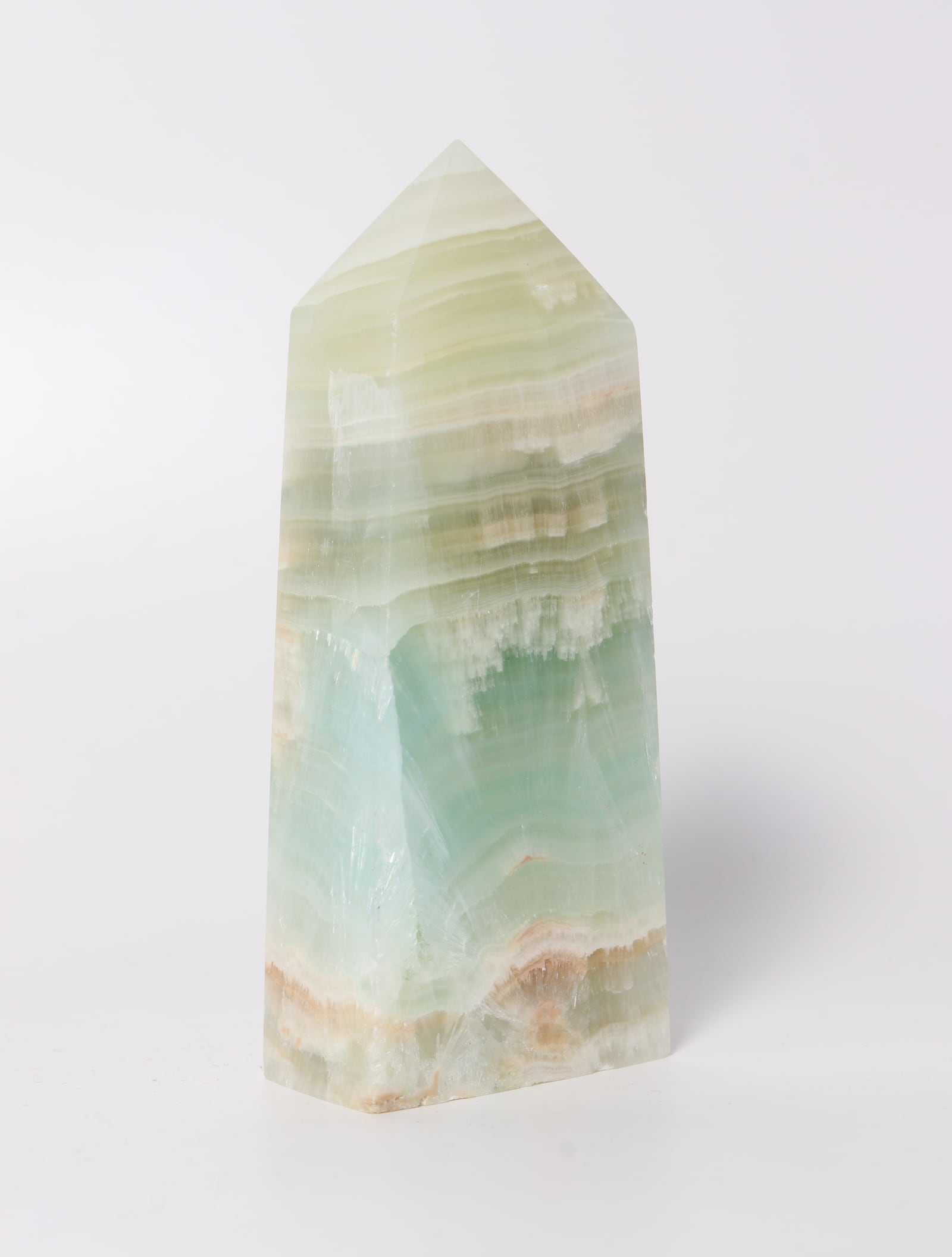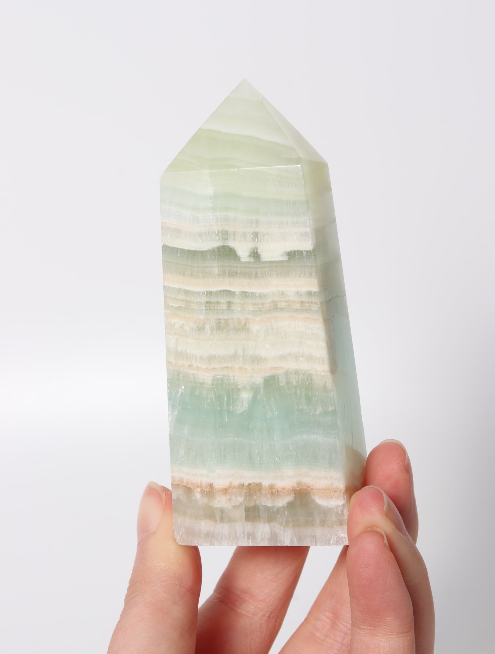 清涼感あふれる色合いが魅力のピスタチオカルサイトのタワーです。美しいオーシャンブルーと砂浜のようなカラーと、地層状の繊細な模様が特徴的です。