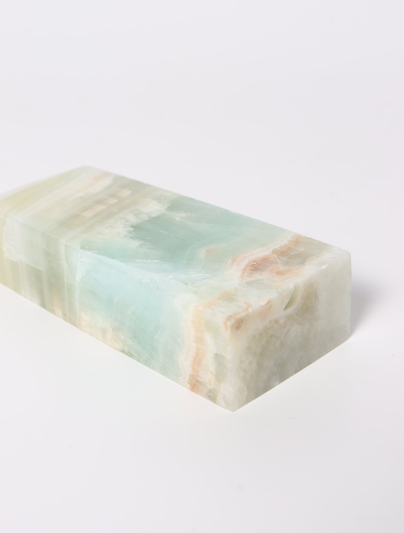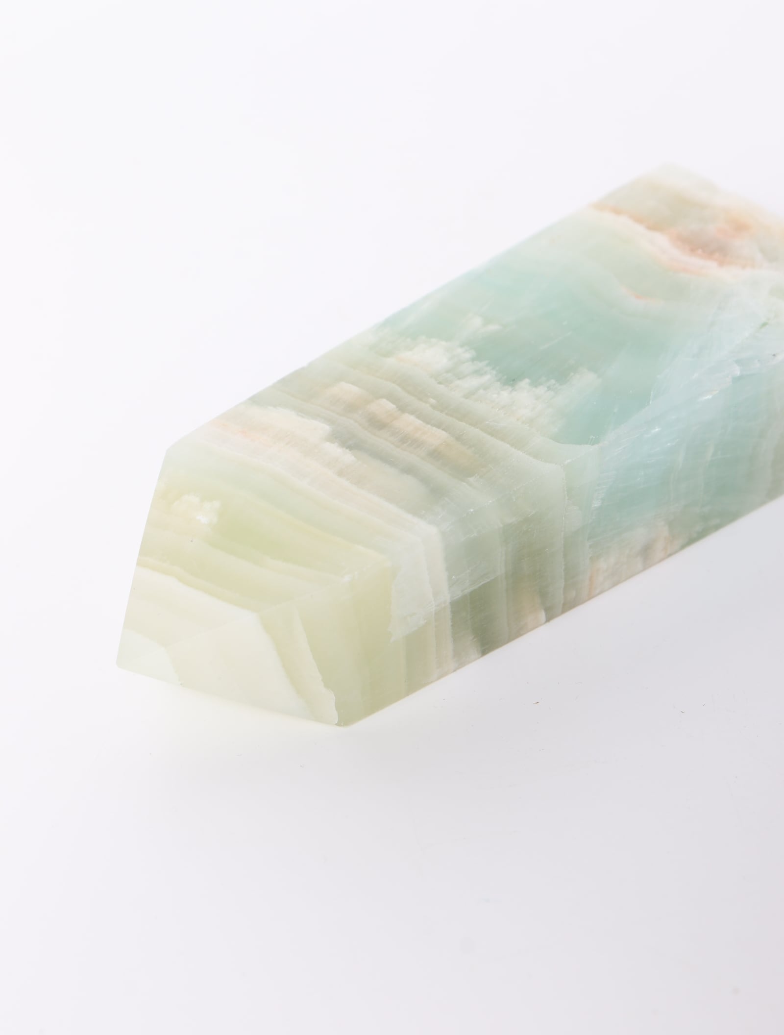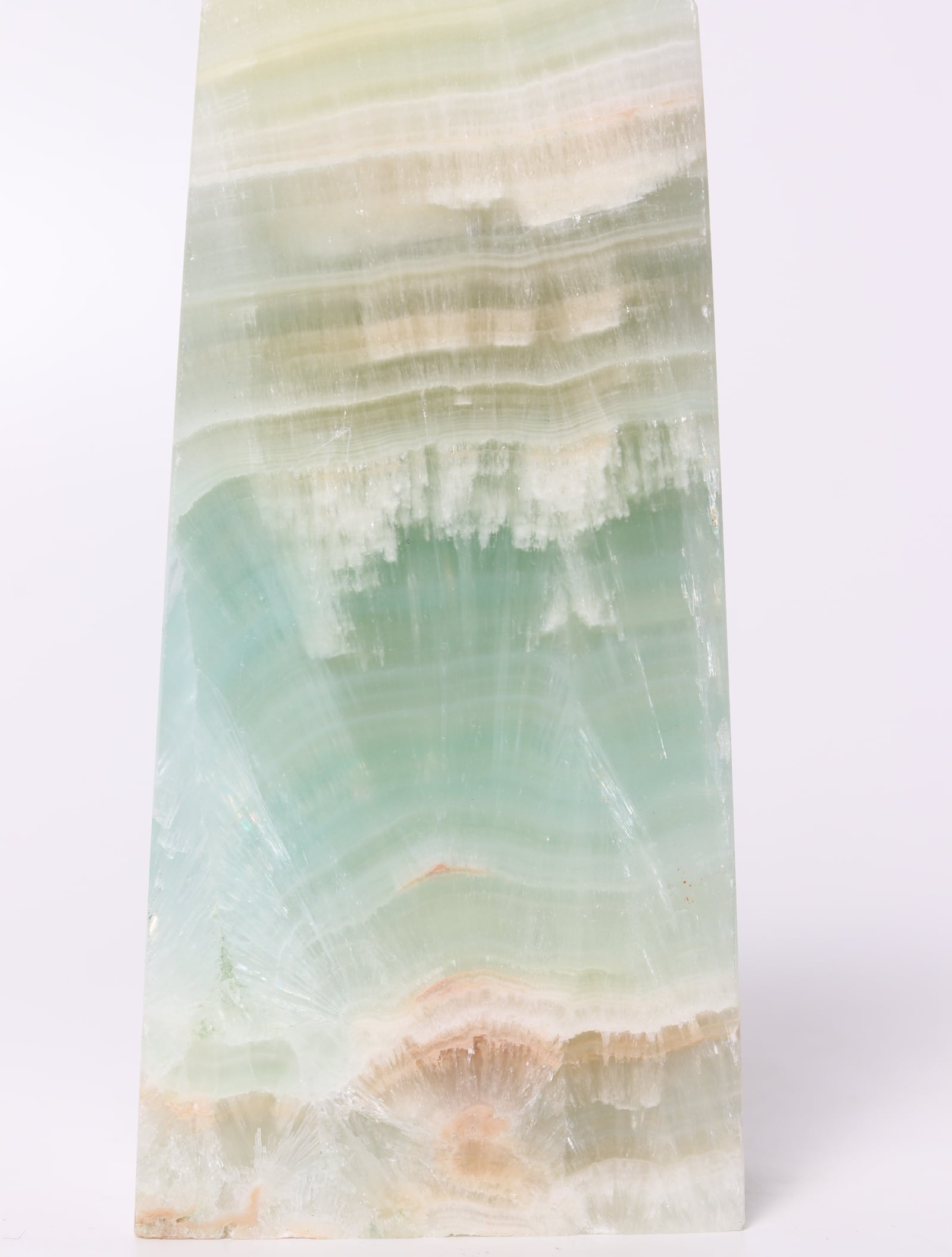 清涼感あふれる色合いが魅力のピスタチオカルサイトのタワーです。美しいオーシャンブルーと砂浜のようなカラーと、地層状の繊細な模様が特徴的です。