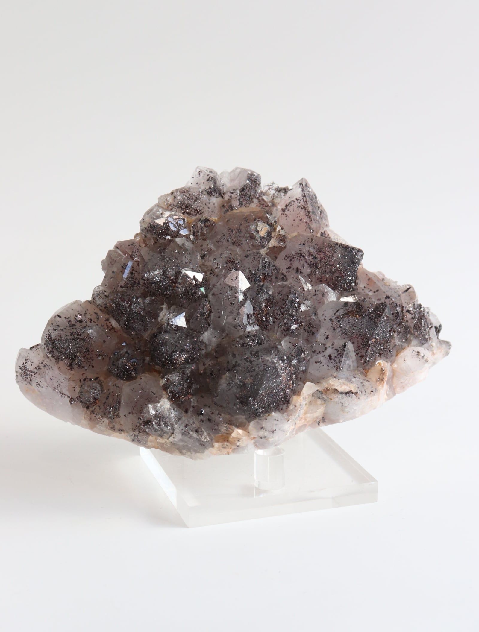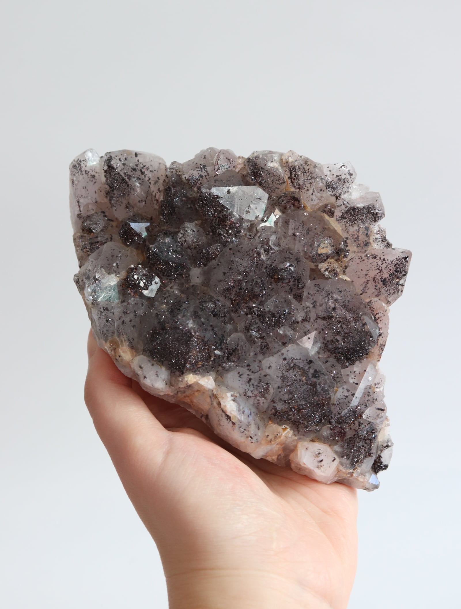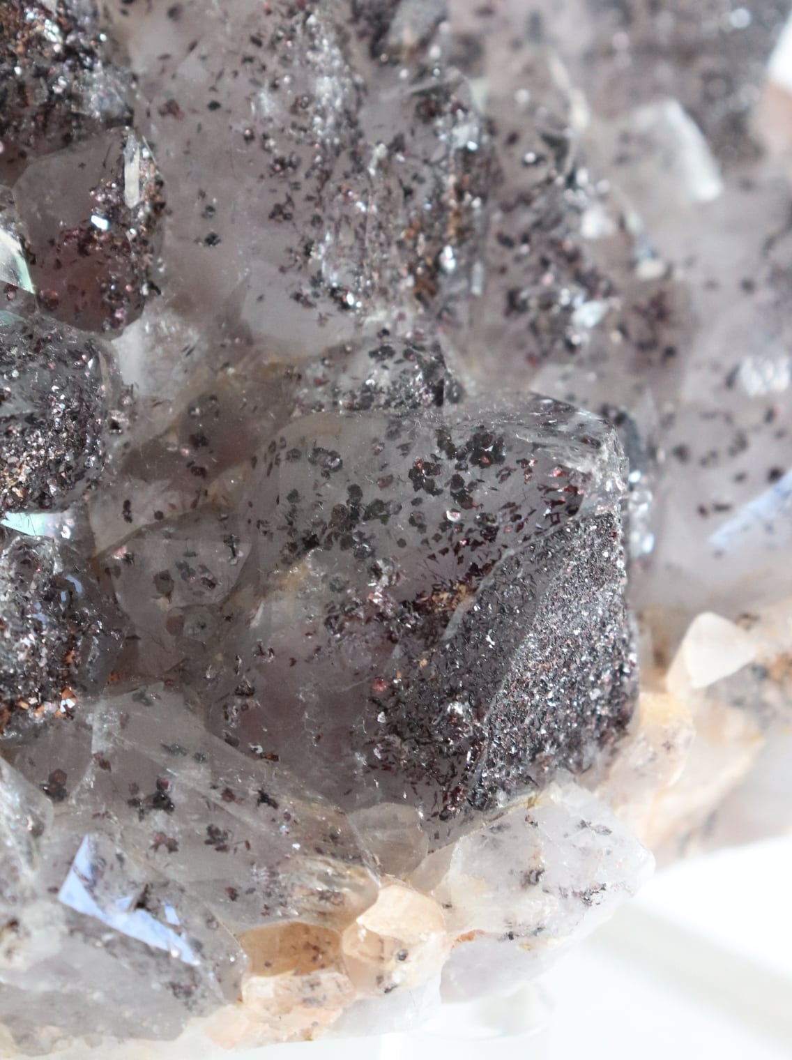 中国・四川省より産出した、希少なレピドクロサイト・オン・クォーツ。透明度・艶感の高い水晶の内部に、黒〜深紅を帯びたレピドクロサイトが星雲のように内包された幻想的な標本です。