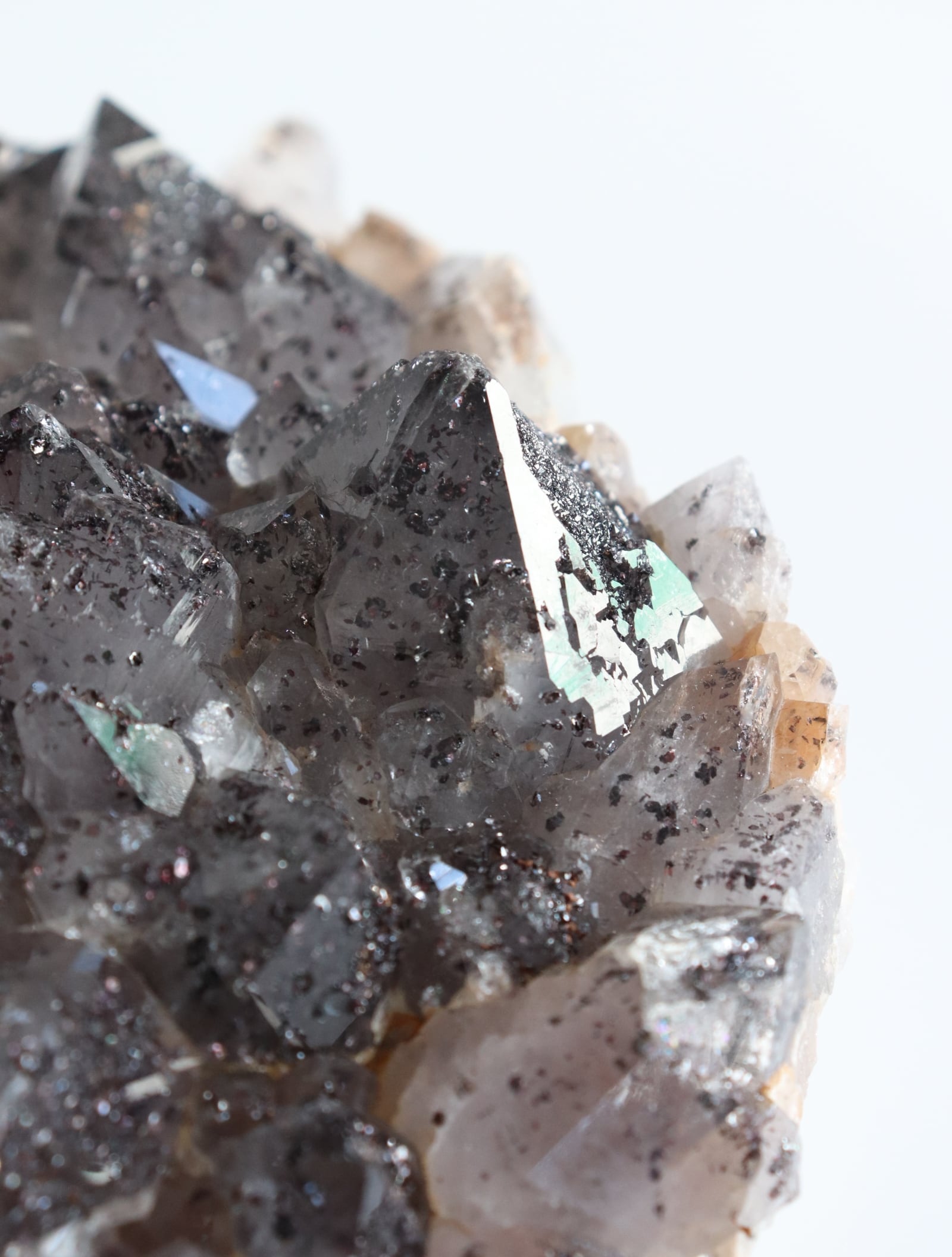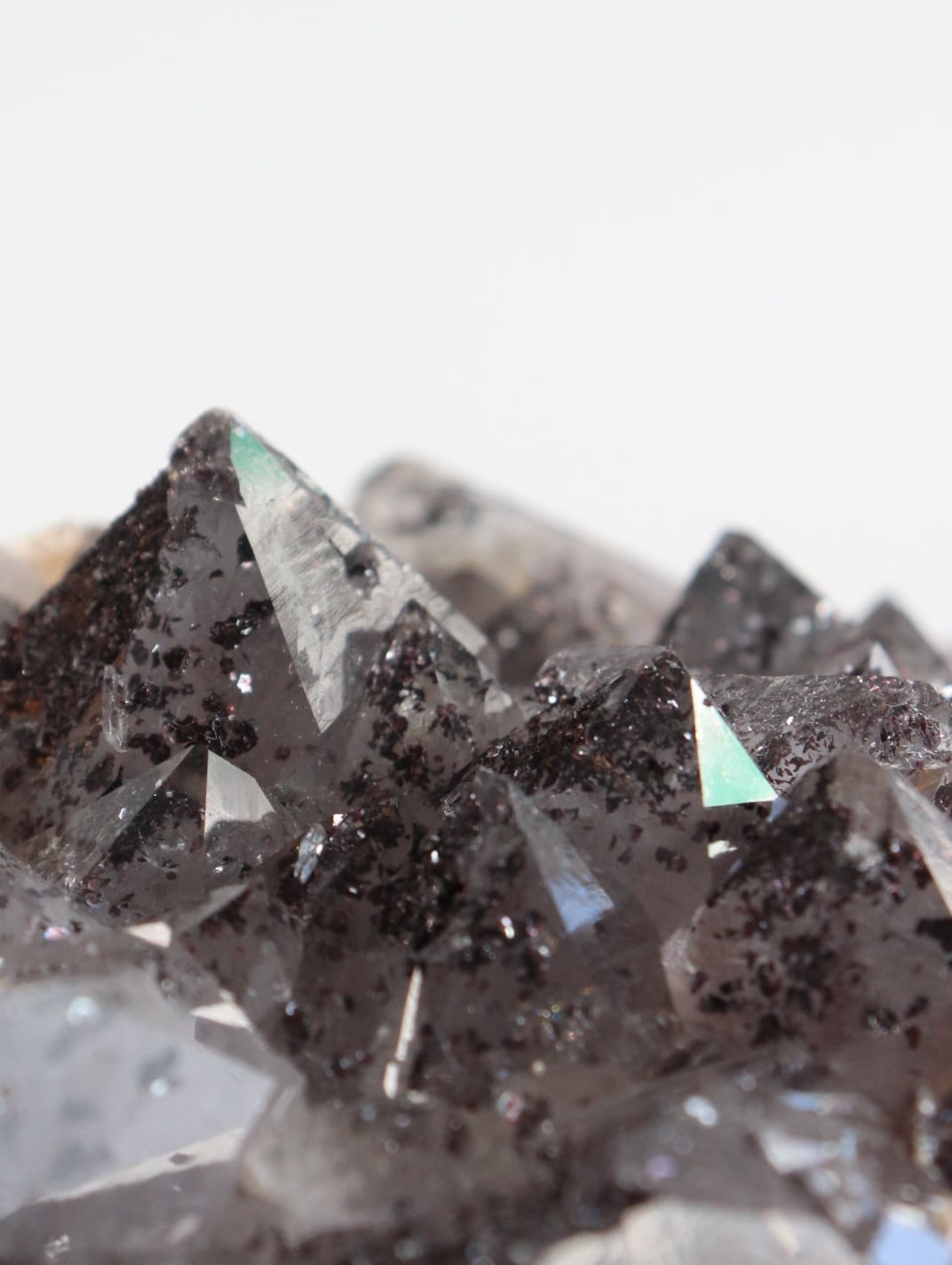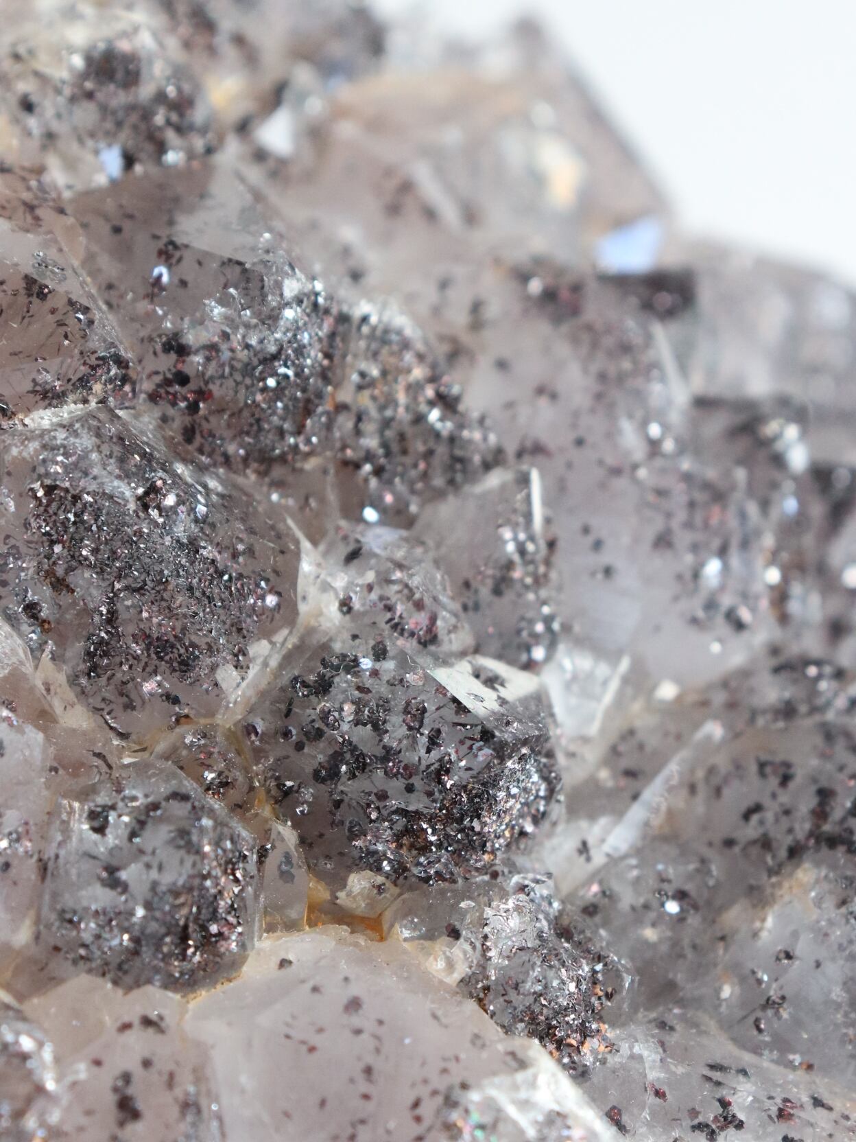 結晶の表面にはシャープな照りと明瞭なファセットが残り、内部に浮かぶ内包物とのコントラストが、奥行きのある景色を生み出しています。角度を変えるたびに、内側から光を返すような独特の輝きが現れ、「閉じ込められた時間」を覗き込んでいるかのような印象を与えます。