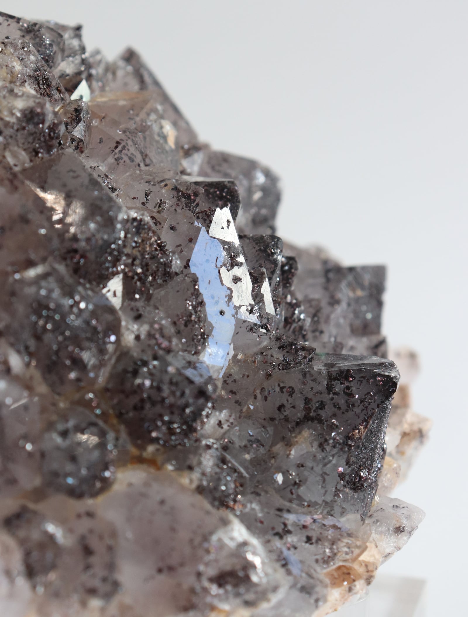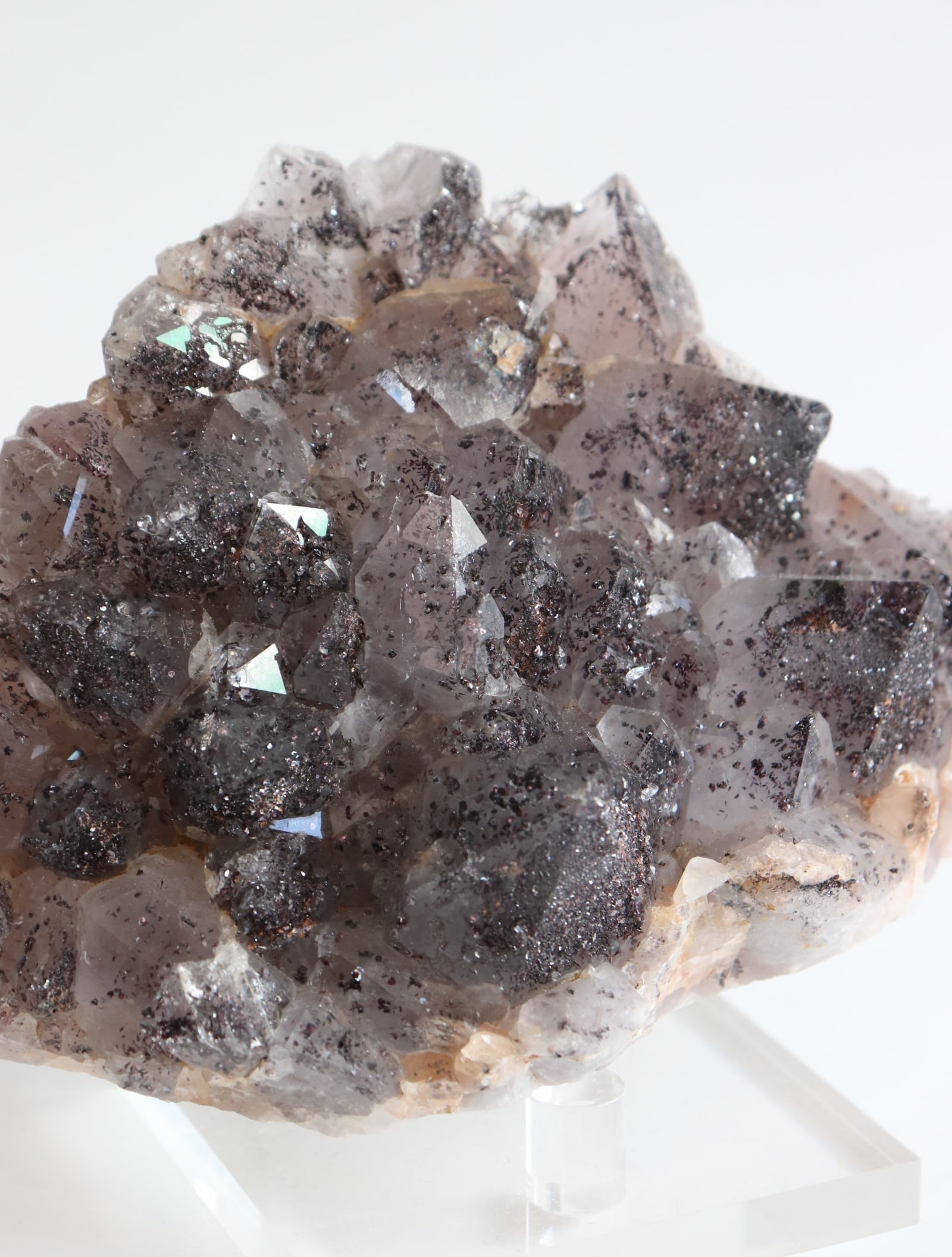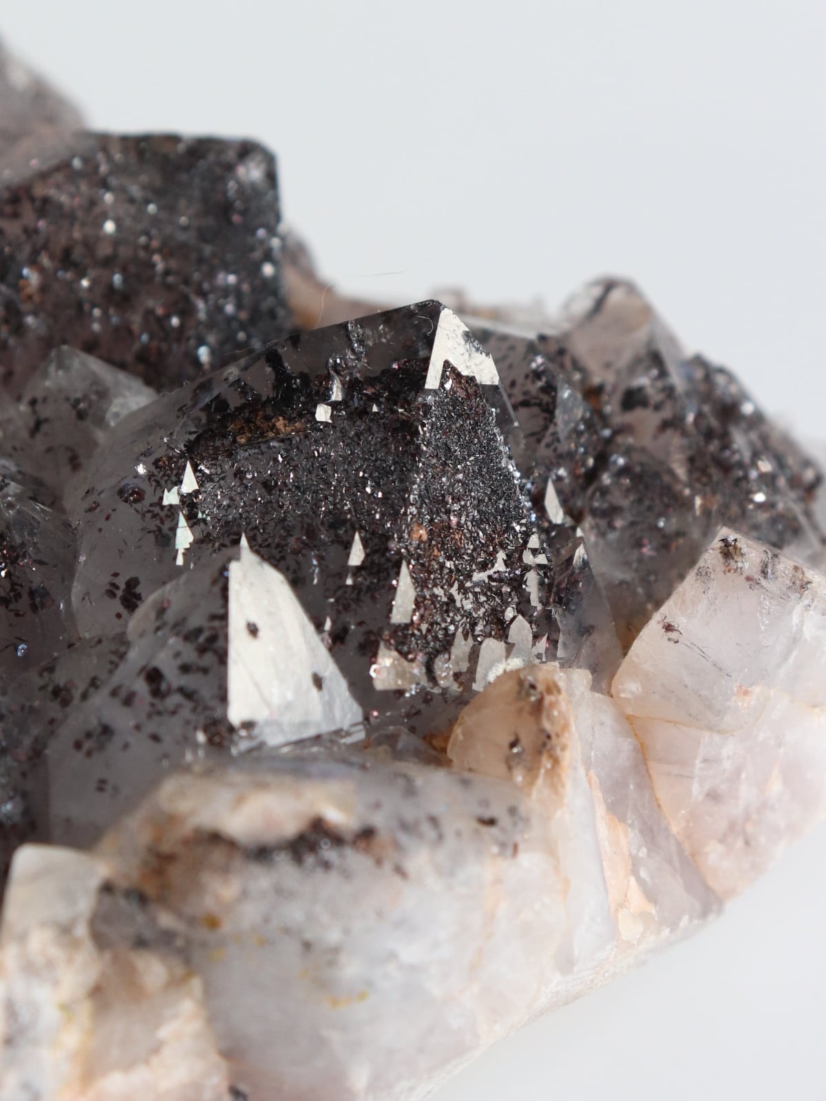 結晶の表面にはシャープな照りと明瞭なファセットが残り、内部に浮かぶ内包物とのコントラストが、奥行きのある景色を生み出しています。角度を変えるたびに、内側から光を返すような独特の輝きが現れ、「閉じ込められた時間」を覗き込んでいるかのような印象を与えます。