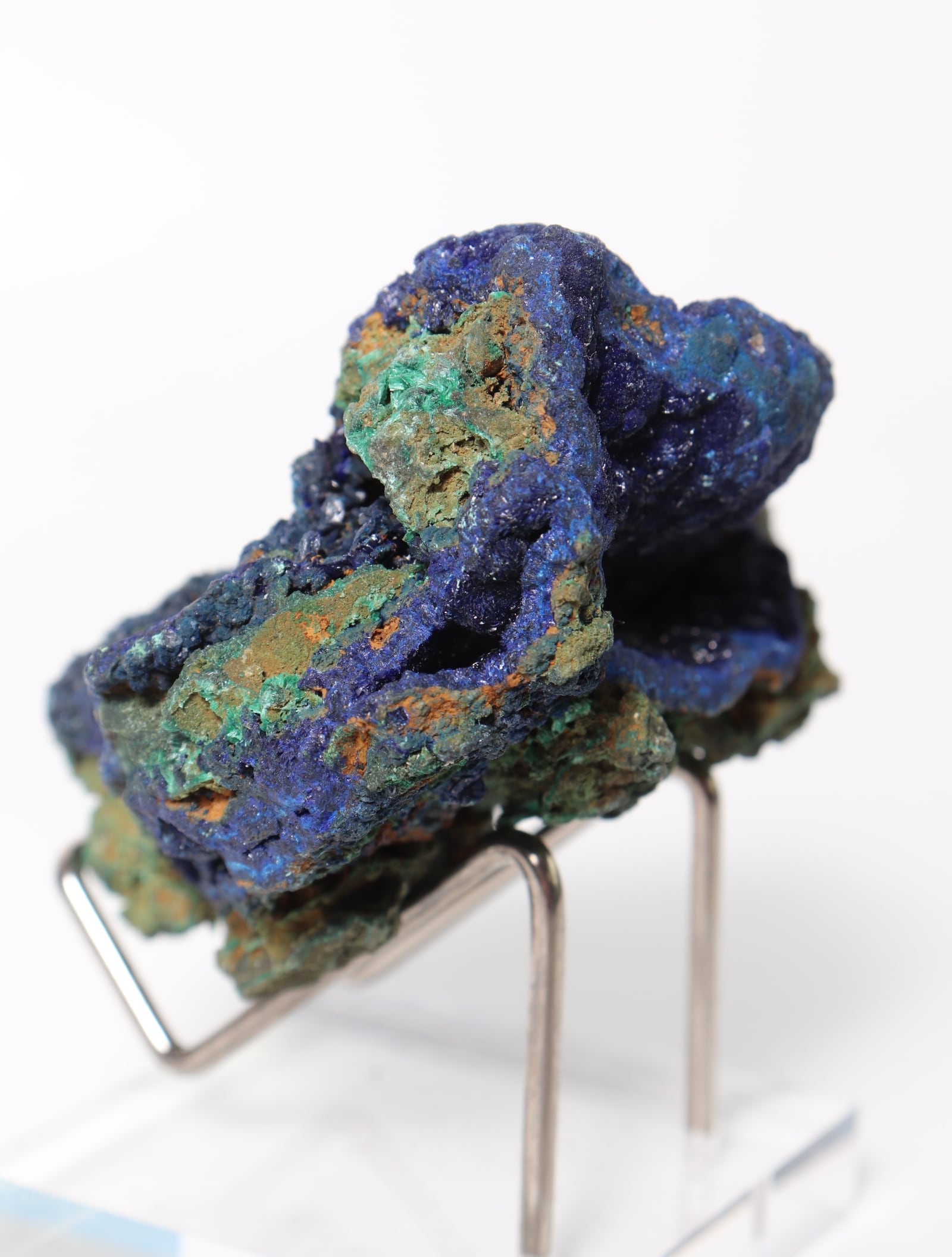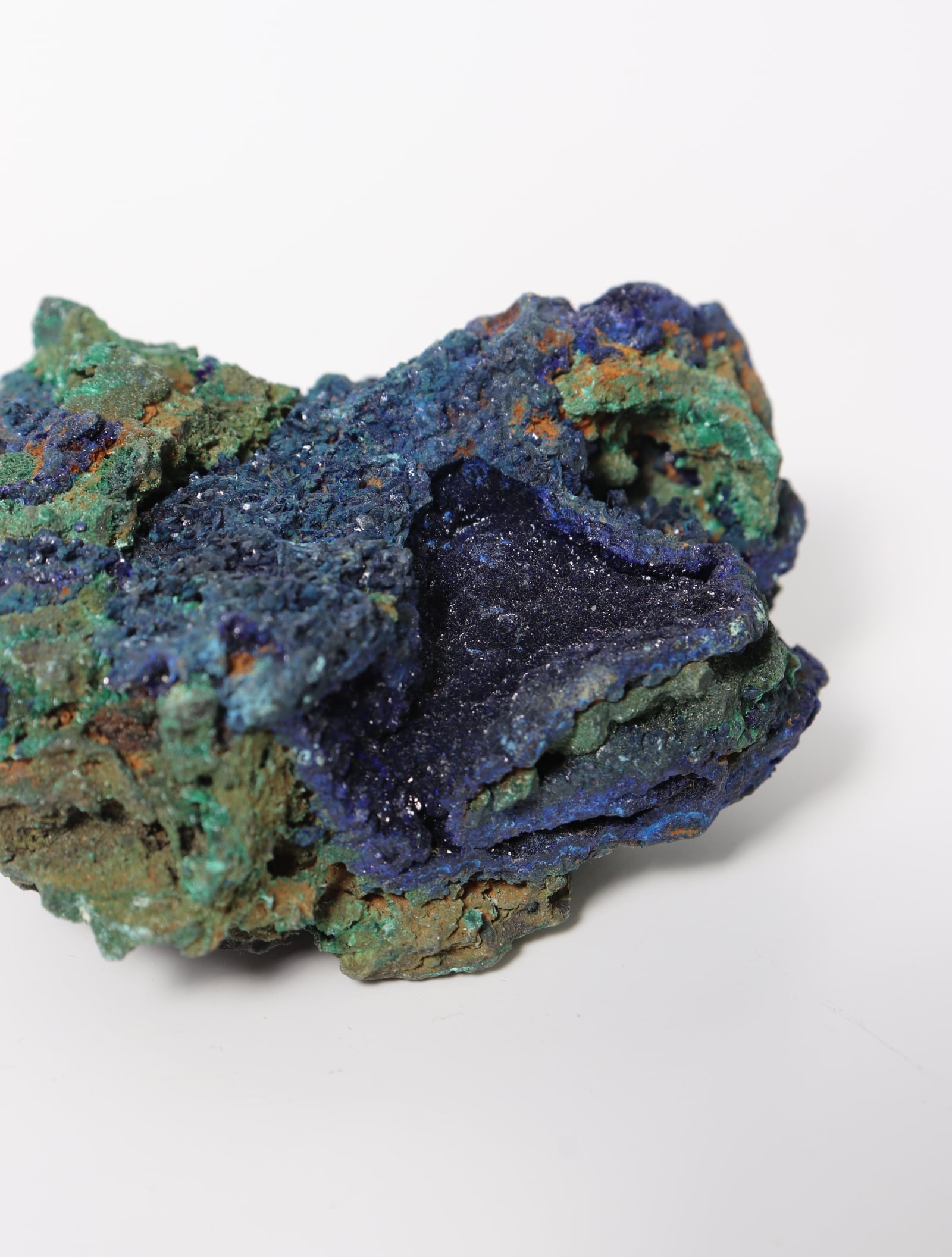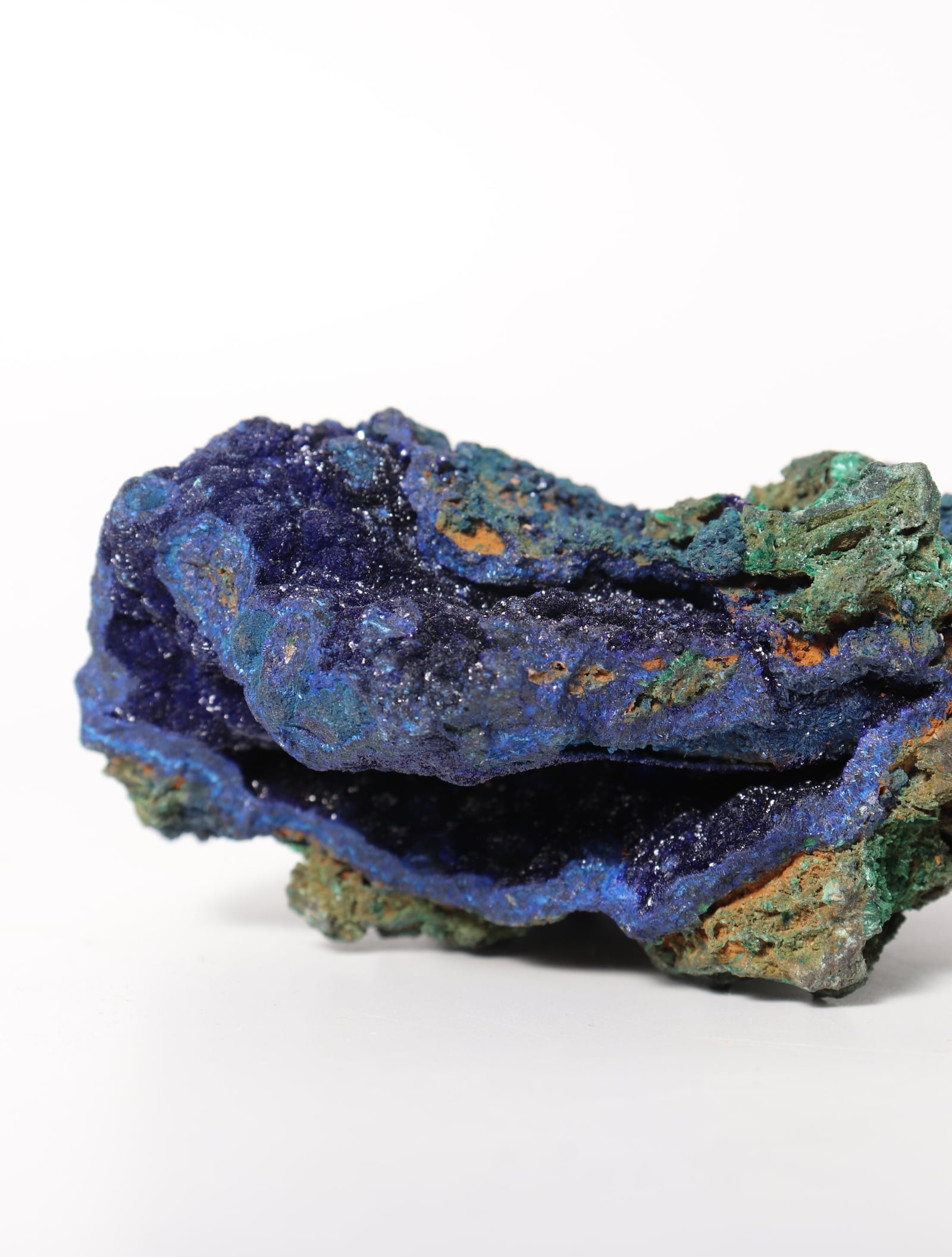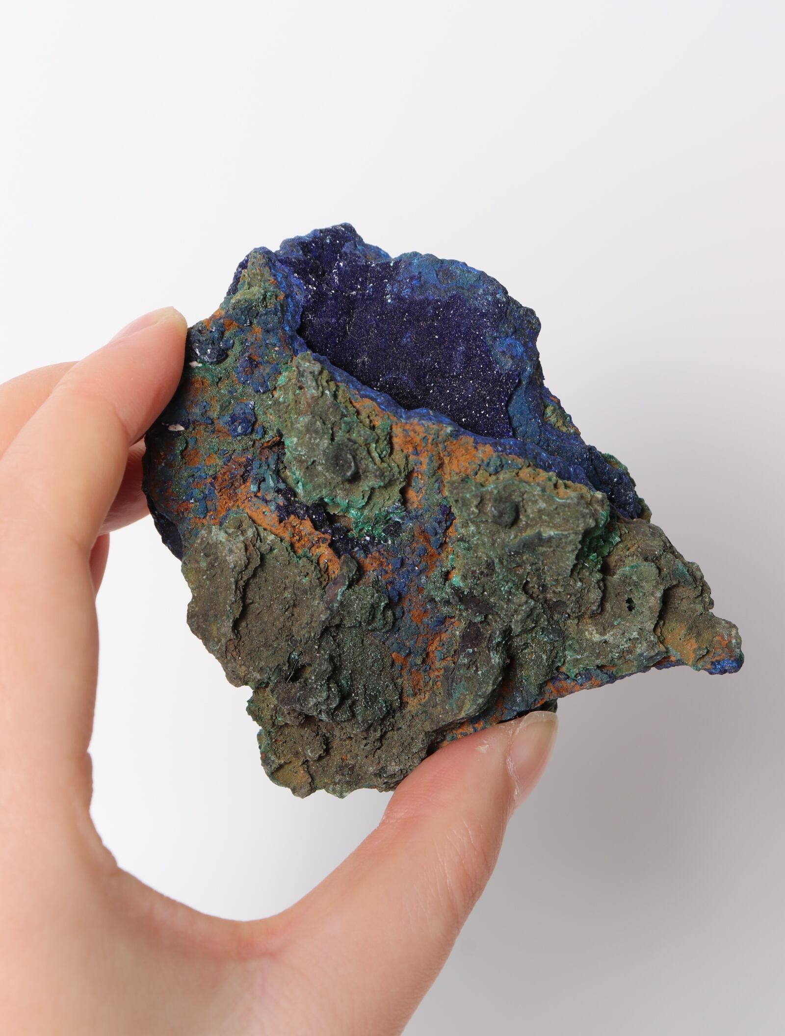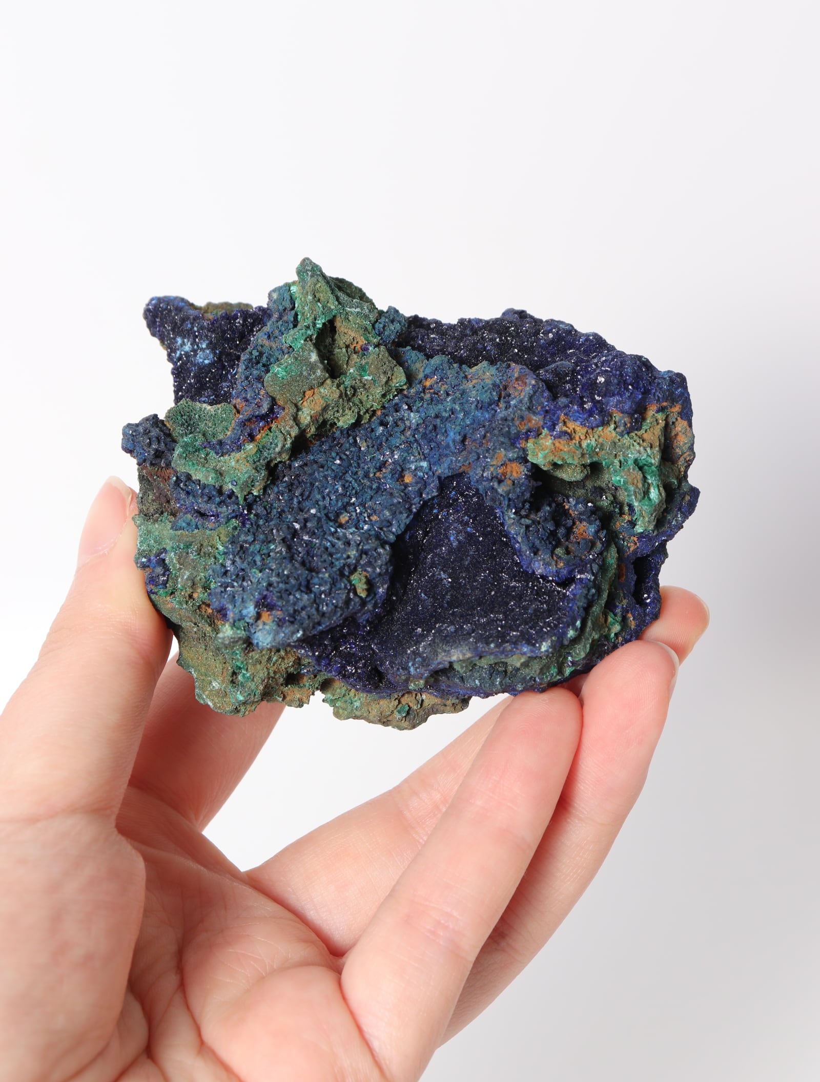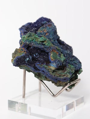 こちらは鮮やかな青色のアズライトに緑色のマラカイトが混合しています。硬度は3~4と極めて脆く刺激に弱いので、水や太陽光に長時間さらさないでください。