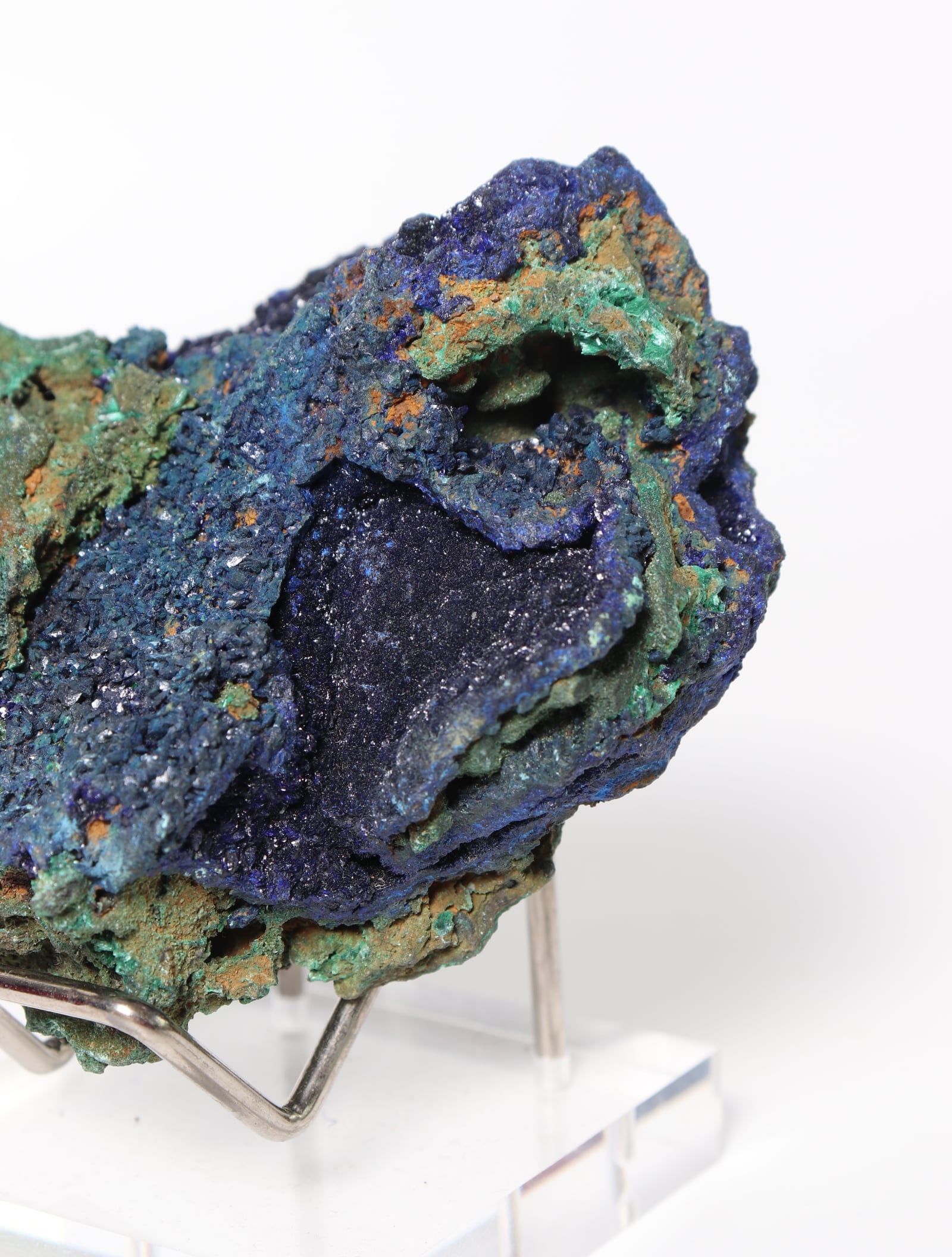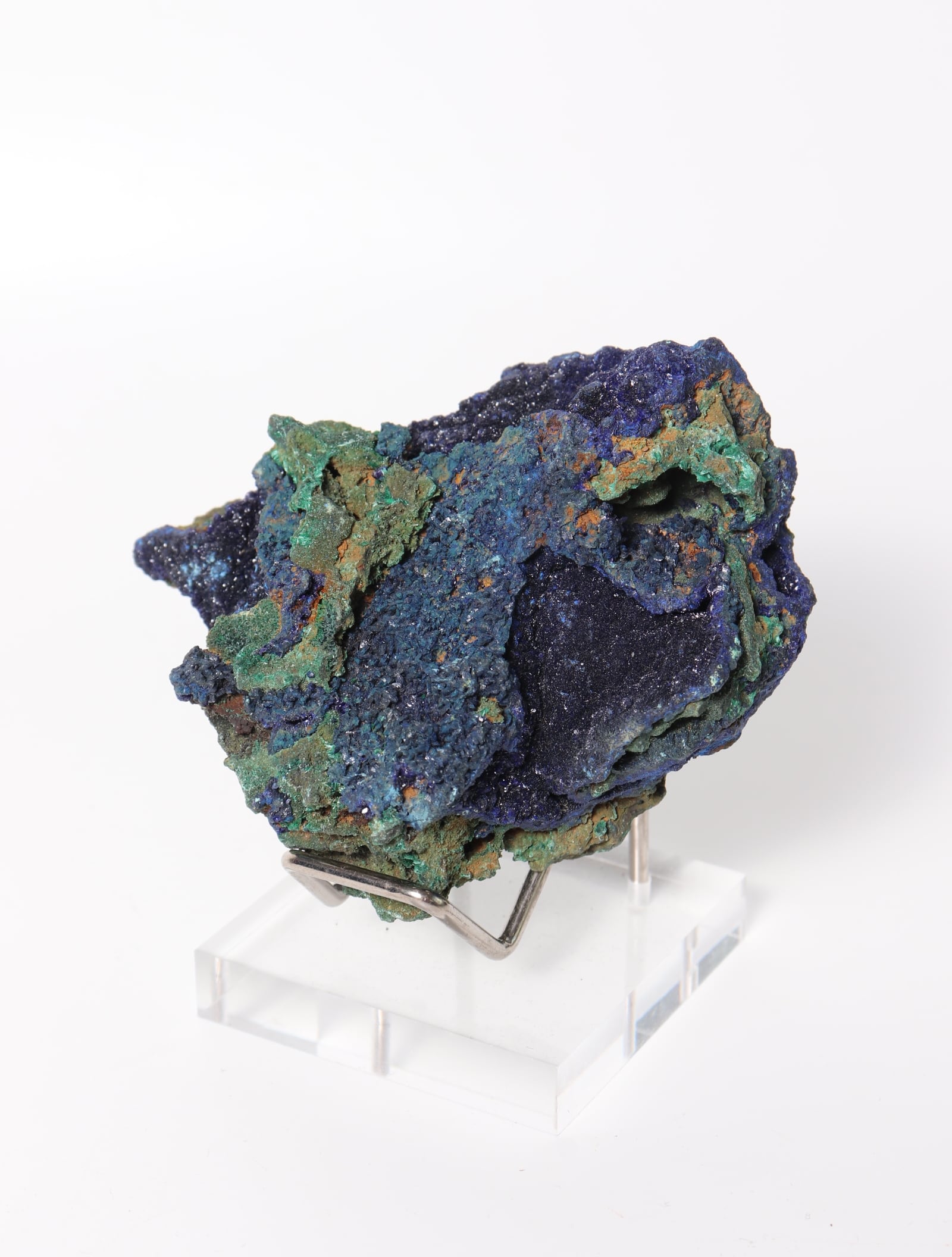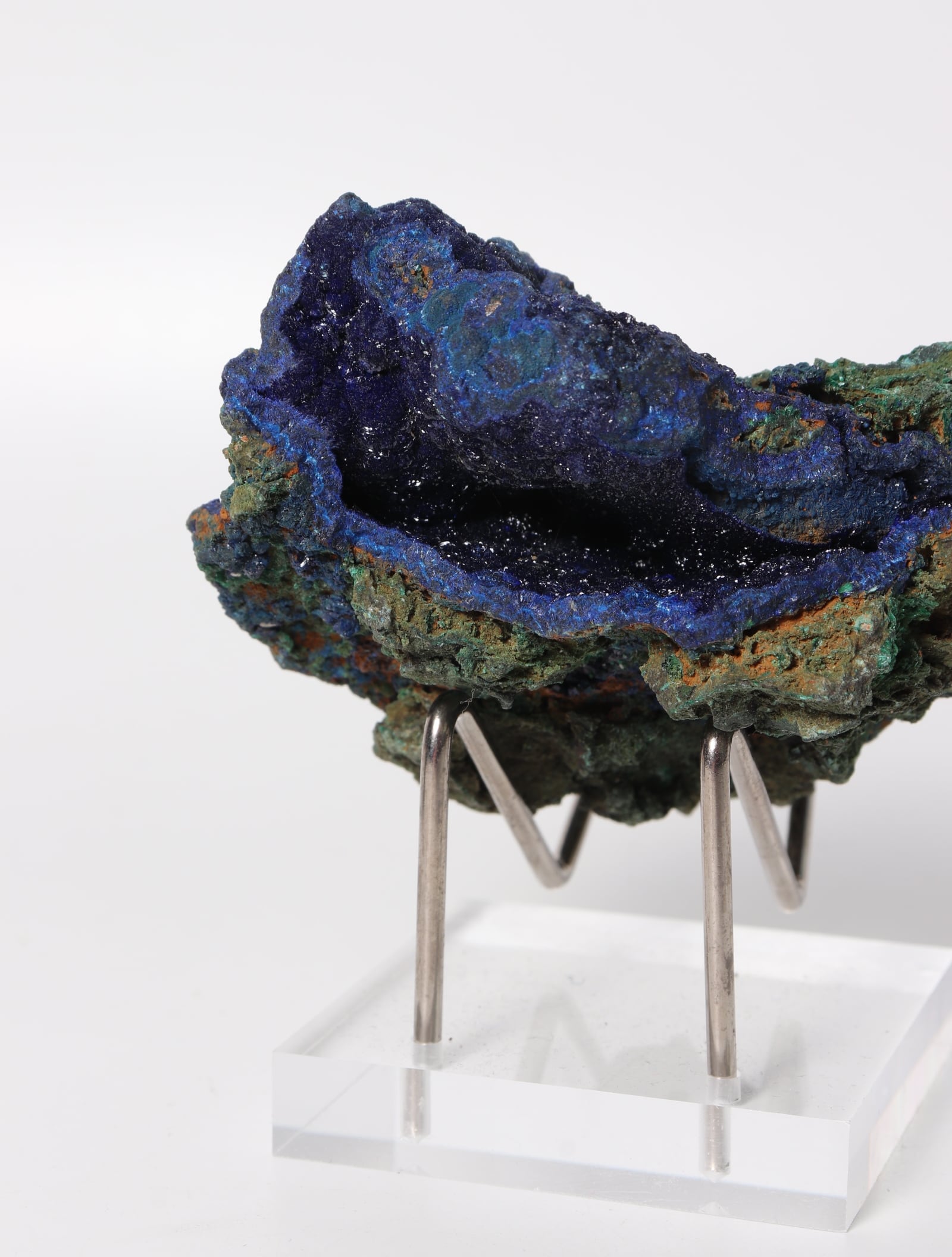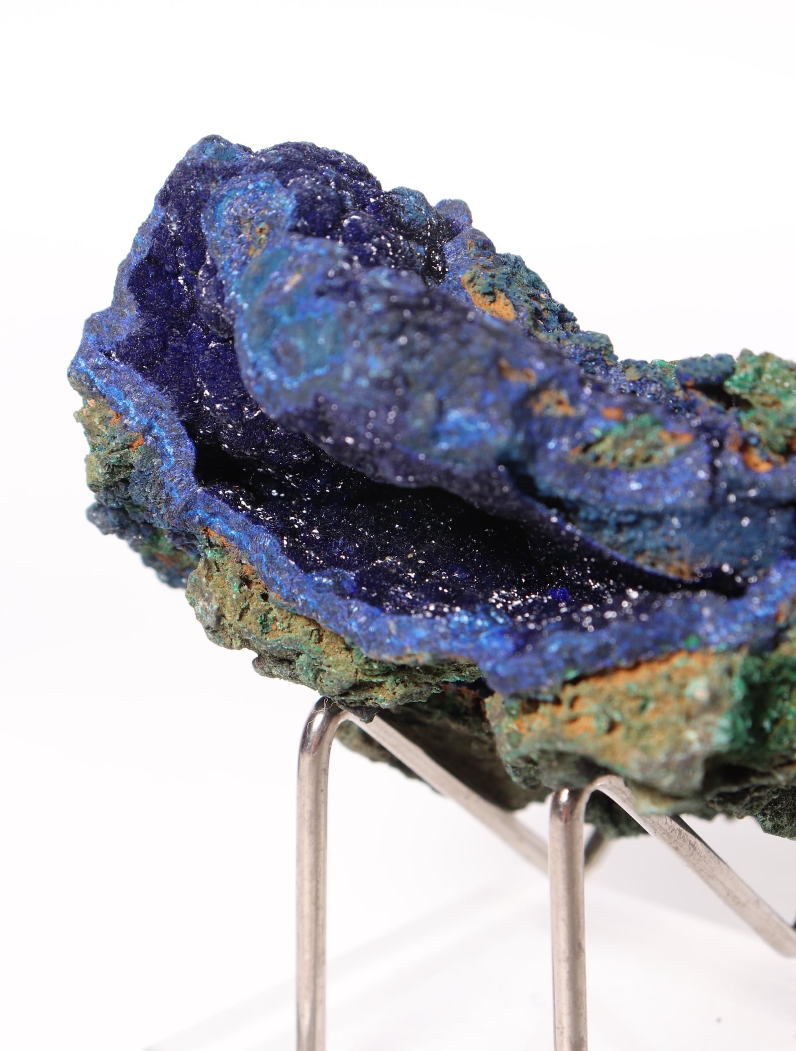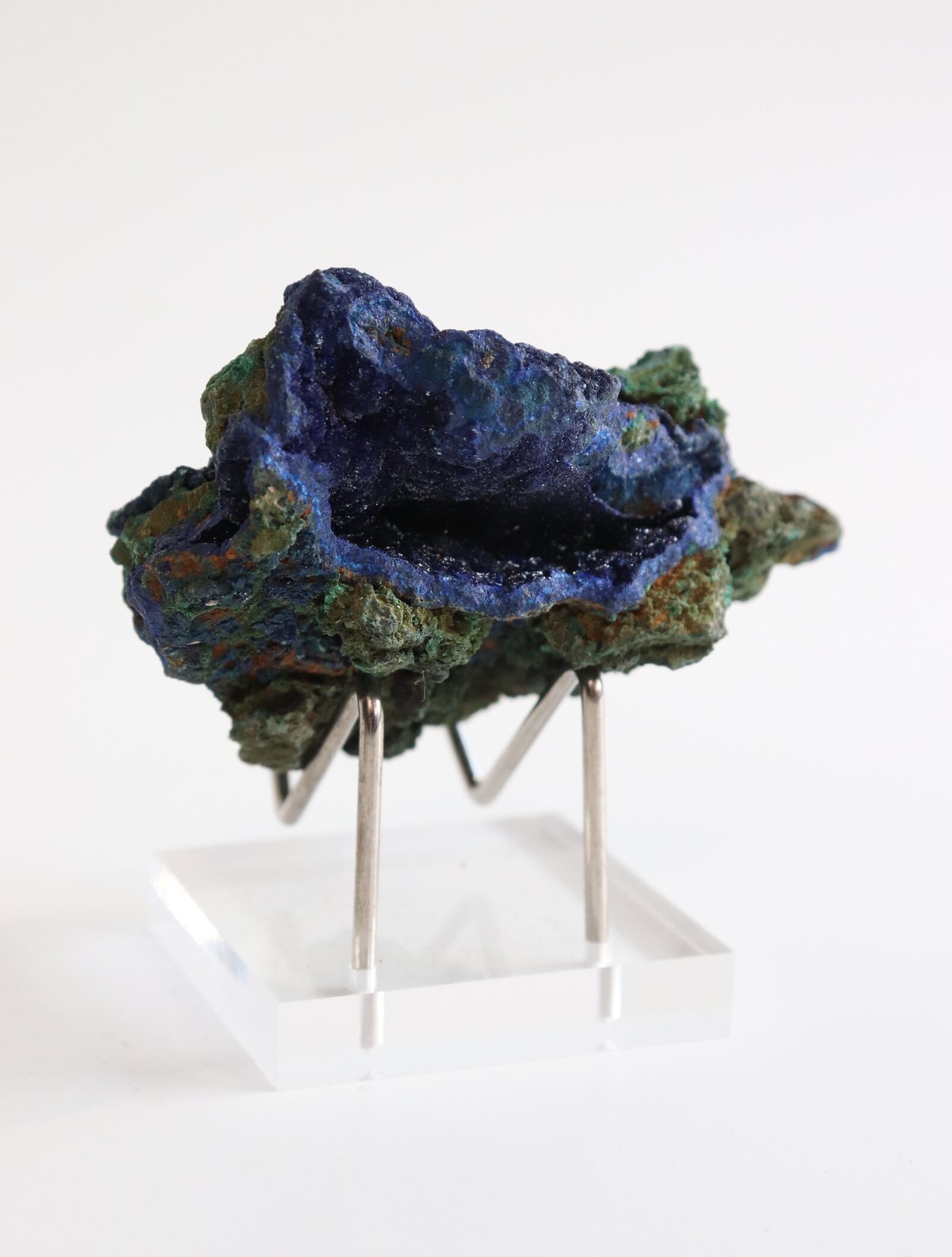 こちらは鮮やかな青色のアズライトに緑色のマラカイトが混合しています。硬度は3~4と極めて脆く刺激に弱いので、水や太陽光に長時間さらさないでください。