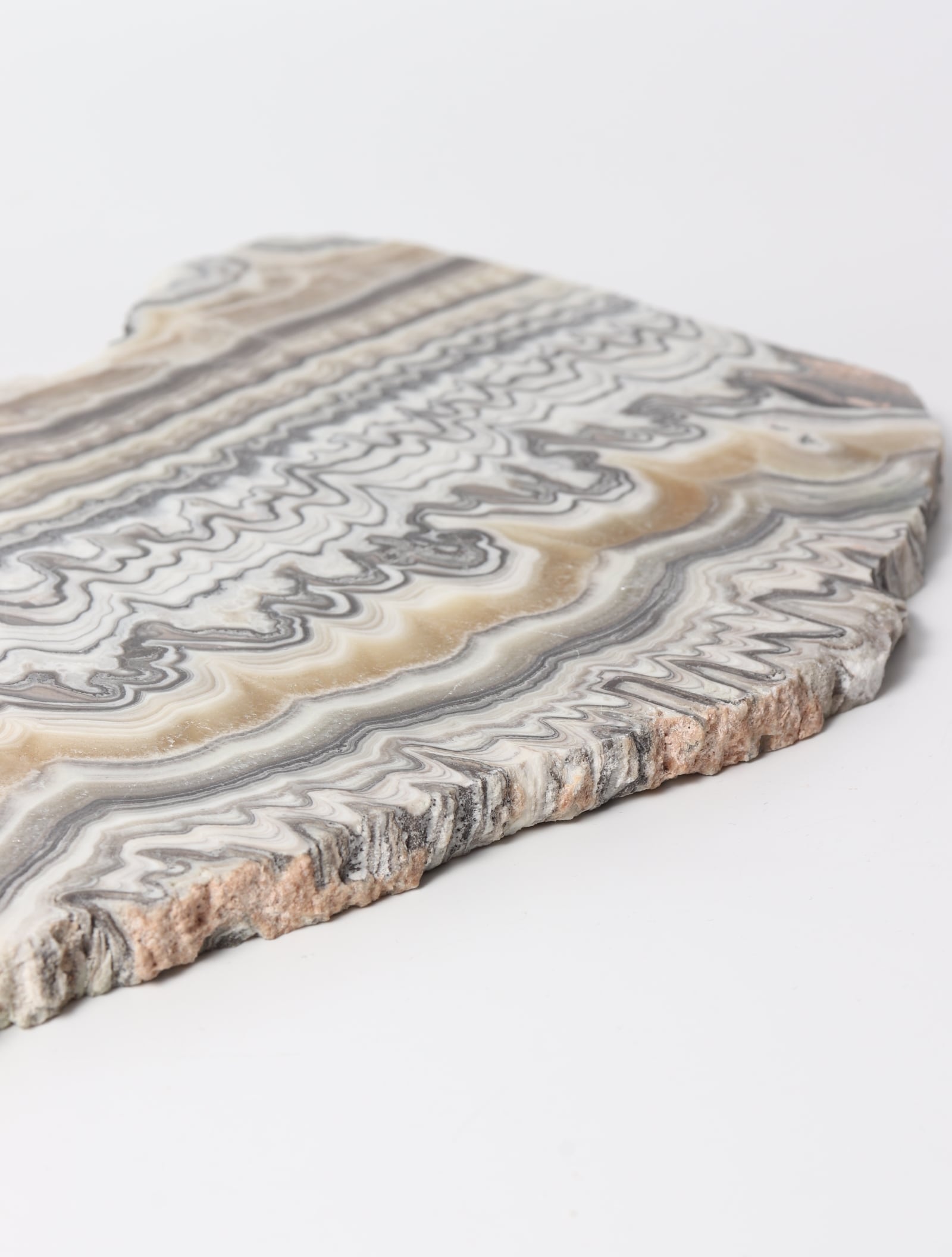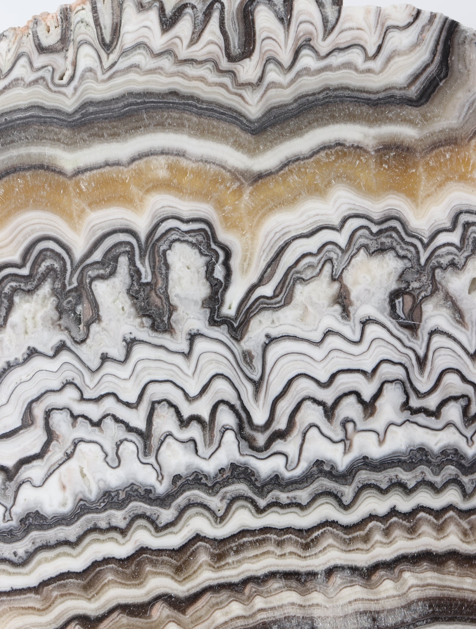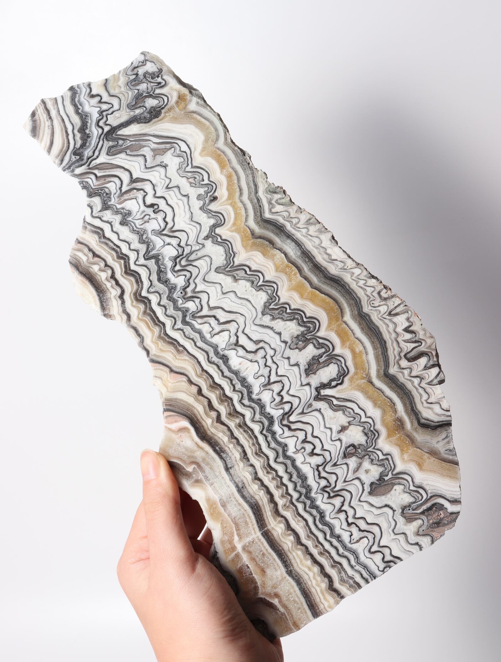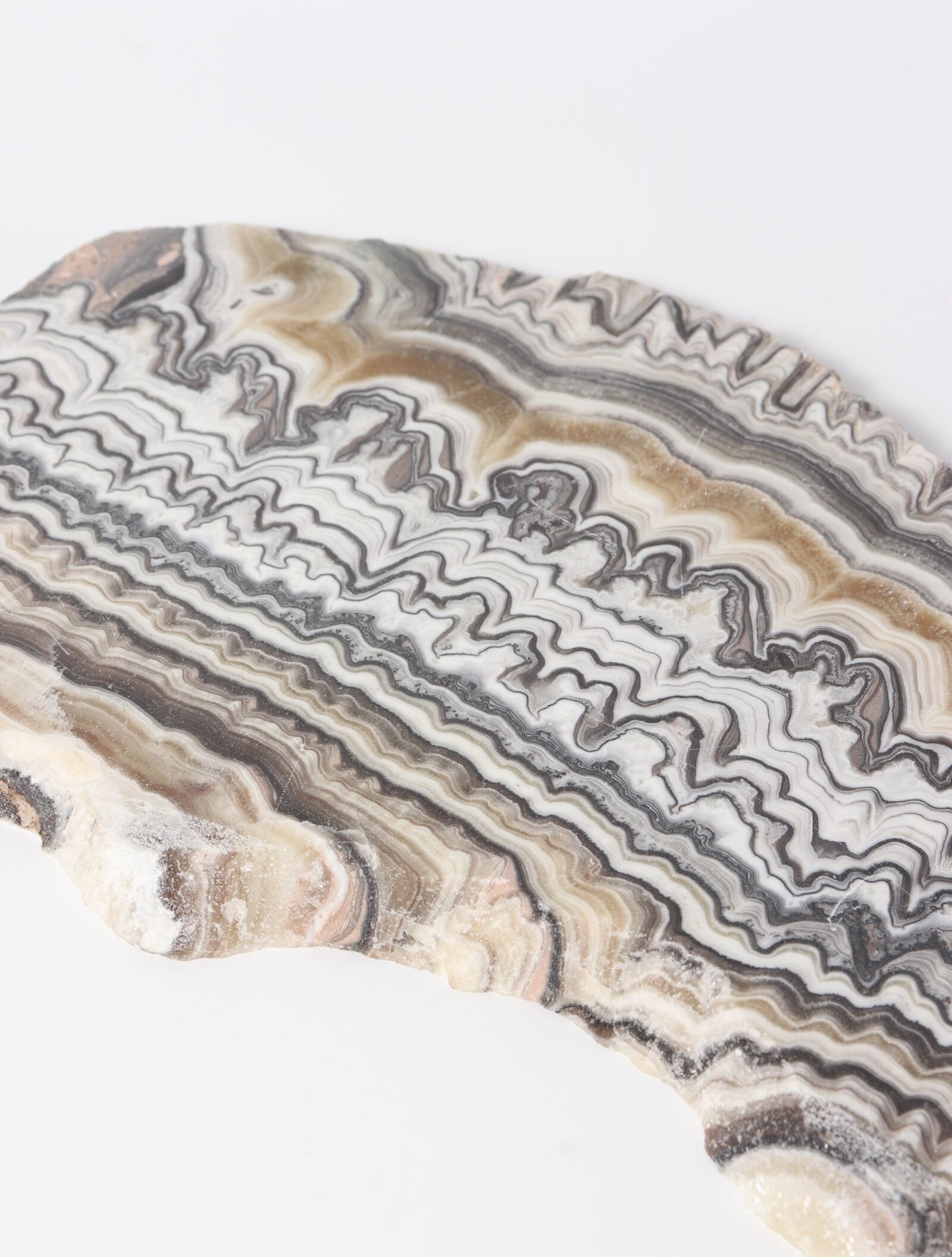 白ベースに茶黒褐色のラインが織りなす、まるでゼブラ模様のような美しいオニキスのスラブ。