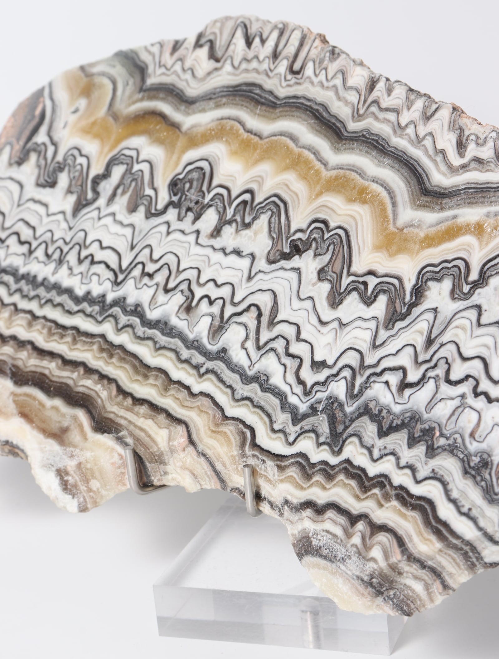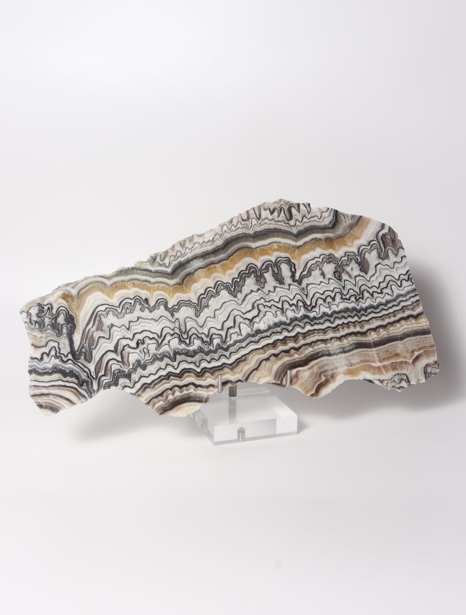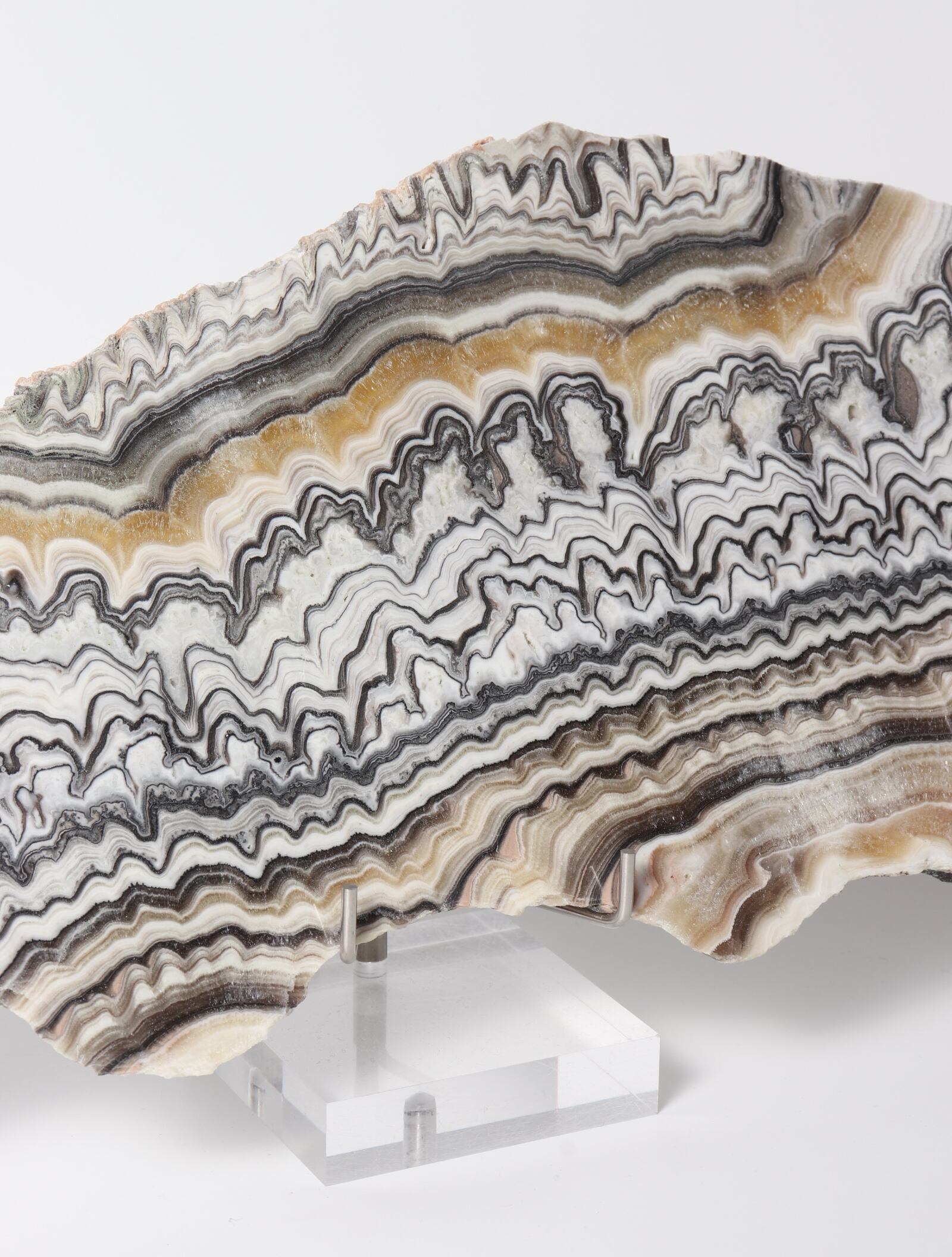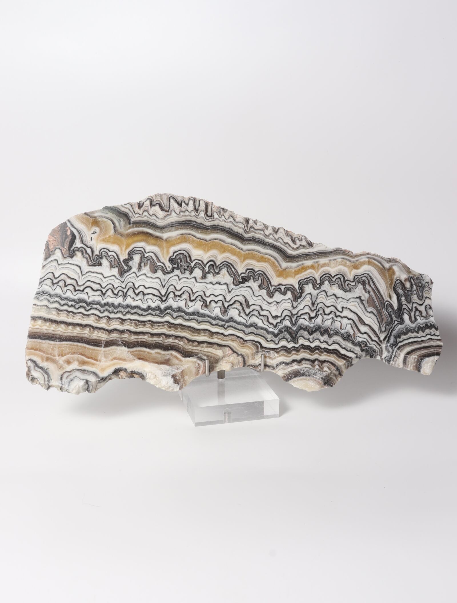 白ベースに茶黒褐色のラインが織りなす、まるでゼブラ模様のような美しいオニキスのスラブ。