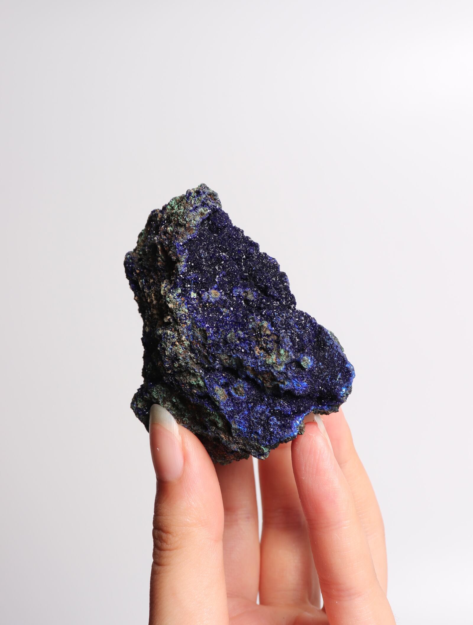 アズライトは銅鉱床にマラカイトと共に産出され、結晶が濃い青色をしている鉱物。和名は藍銅鉱(らんどうこう)まさしく藍色に彩られた天然石。光を当てると、微細な結晶部分が深い瑠璃色でキラキラと輝きます。