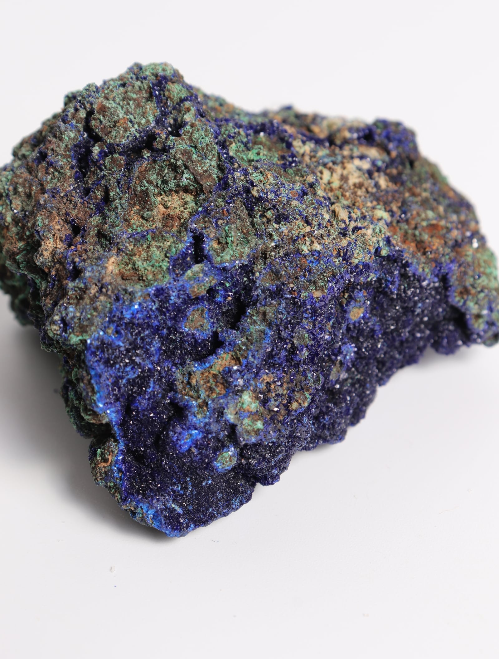 こちらは鮮やかな青色のアズライトに緑色のマラカイトが混合しています。硬度は3~4と極めて脆く刺激に弱いので、水や太陽光に長時間さらさないでください。
