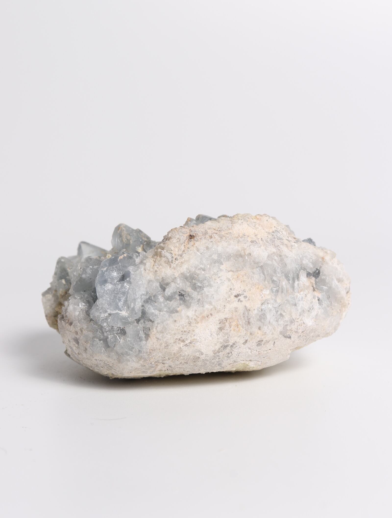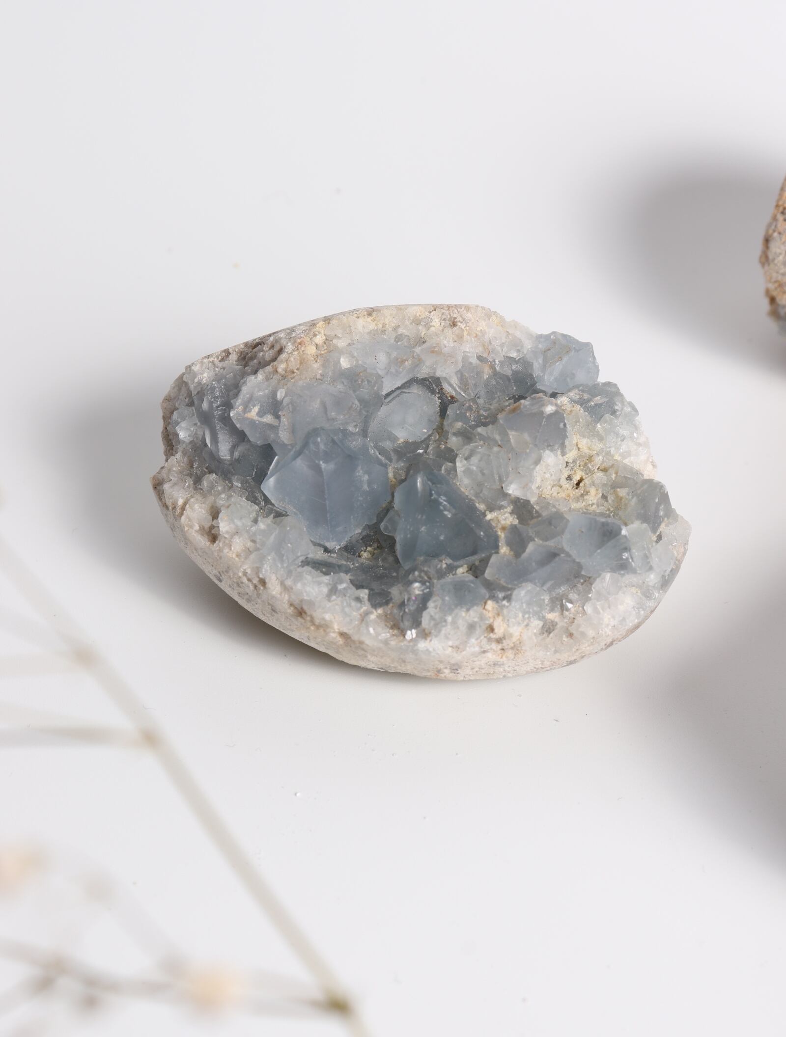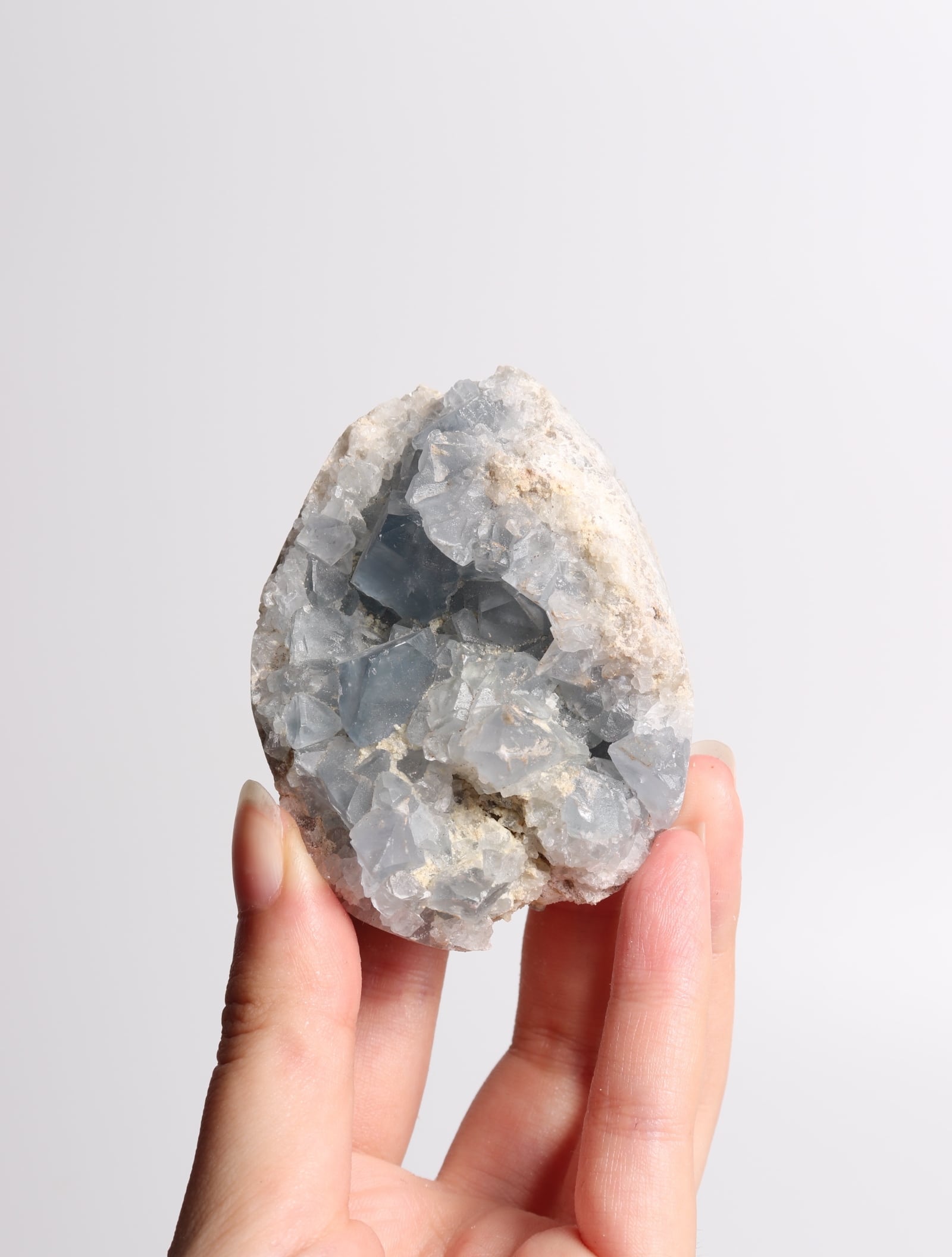 こちらは母岩付きの卵型をしているセレスタイトの原石。母岩は砂利質なので、触ると少し落ちてきます。石の特性上非常に柔らかく割れやすい性質なので、水や太陽光での浄化は避けましょう。取り扱いには十分ご注意してください。