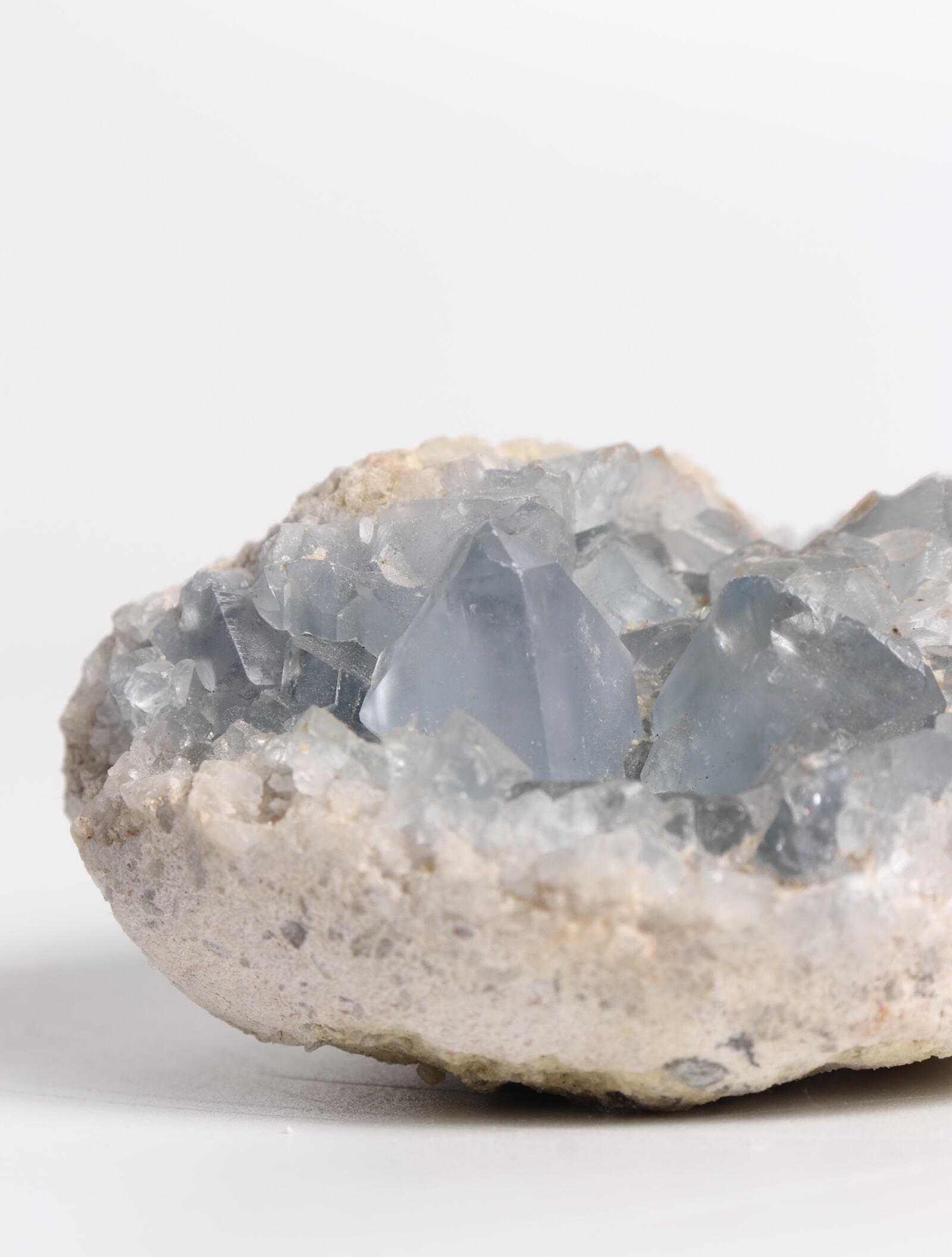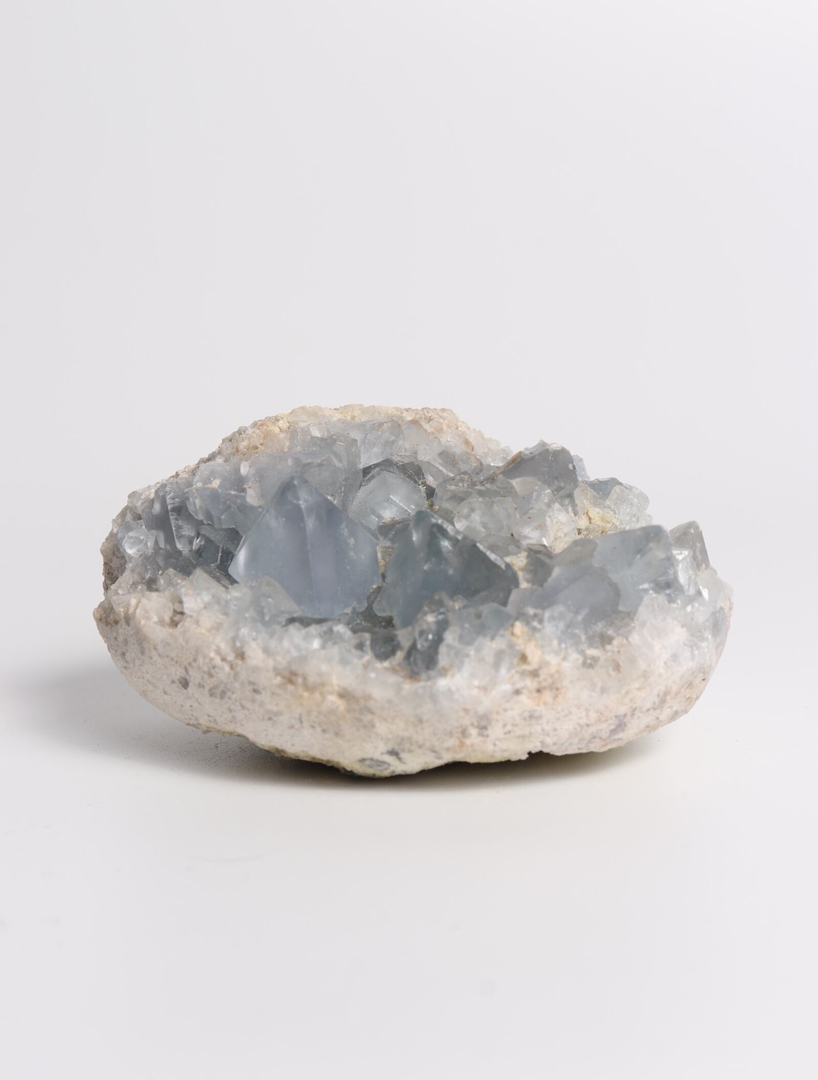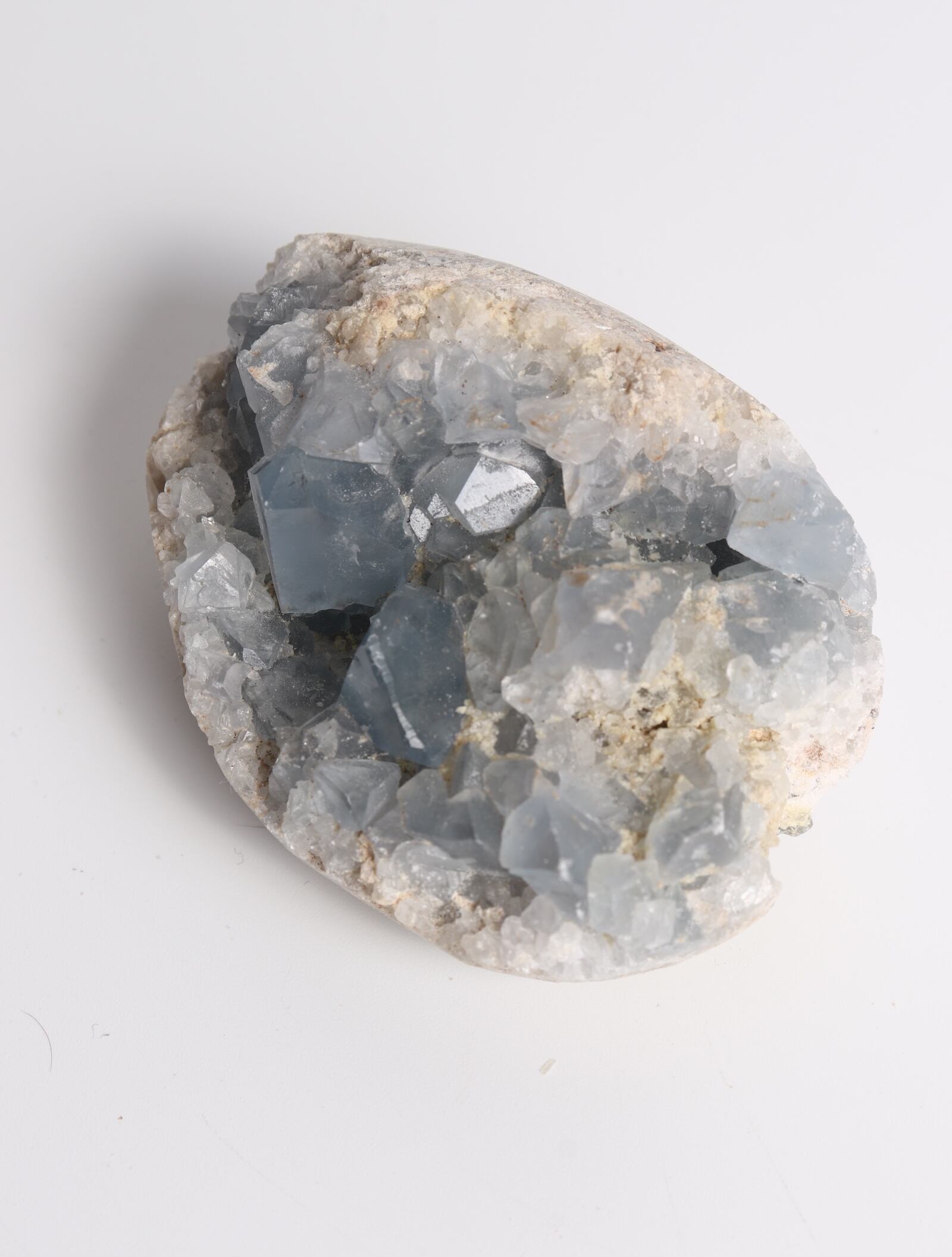 こちらは母岩付きの卵型をしているセレスタイトの原石。母岩は砂利質なので、触ると少し落ちてきます。石の特性上非常に柔らかく割れやすい性質なので、水や太陽光での浄化は避けましょう。取り扱いには十分ご注意してください。