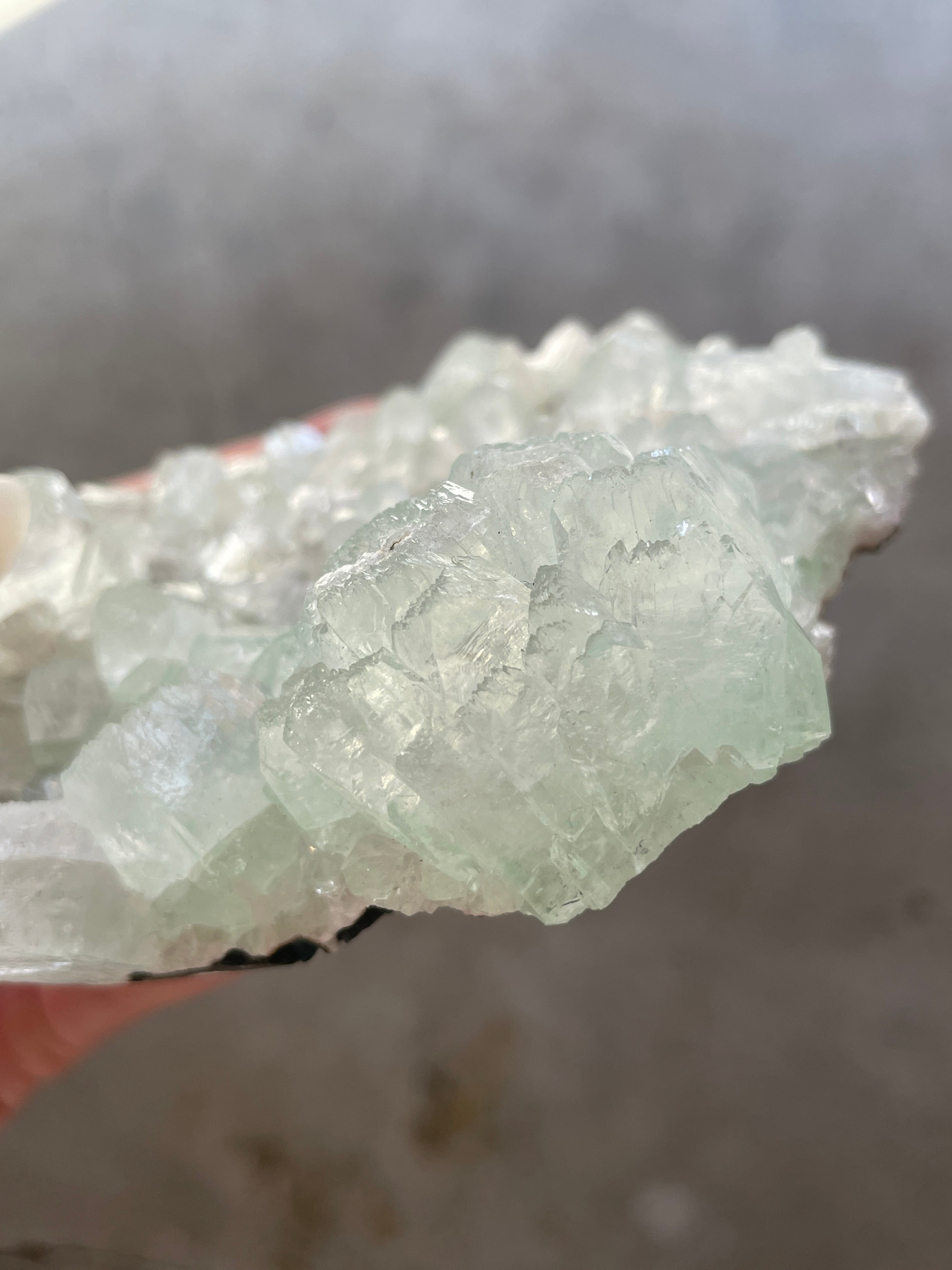 こちらのグリーンアポフィライトはやや明るめのアップルグリーンが見られ珍しい色味。全体の透明度が高く、特に数カ所大粒な結晶の上部では細かいトゲトゲした表面があります。最後2枚の画像をアップするか、インスタの動画をご覧ください。アポフィライトでこの模様があるの不思議です〜!!