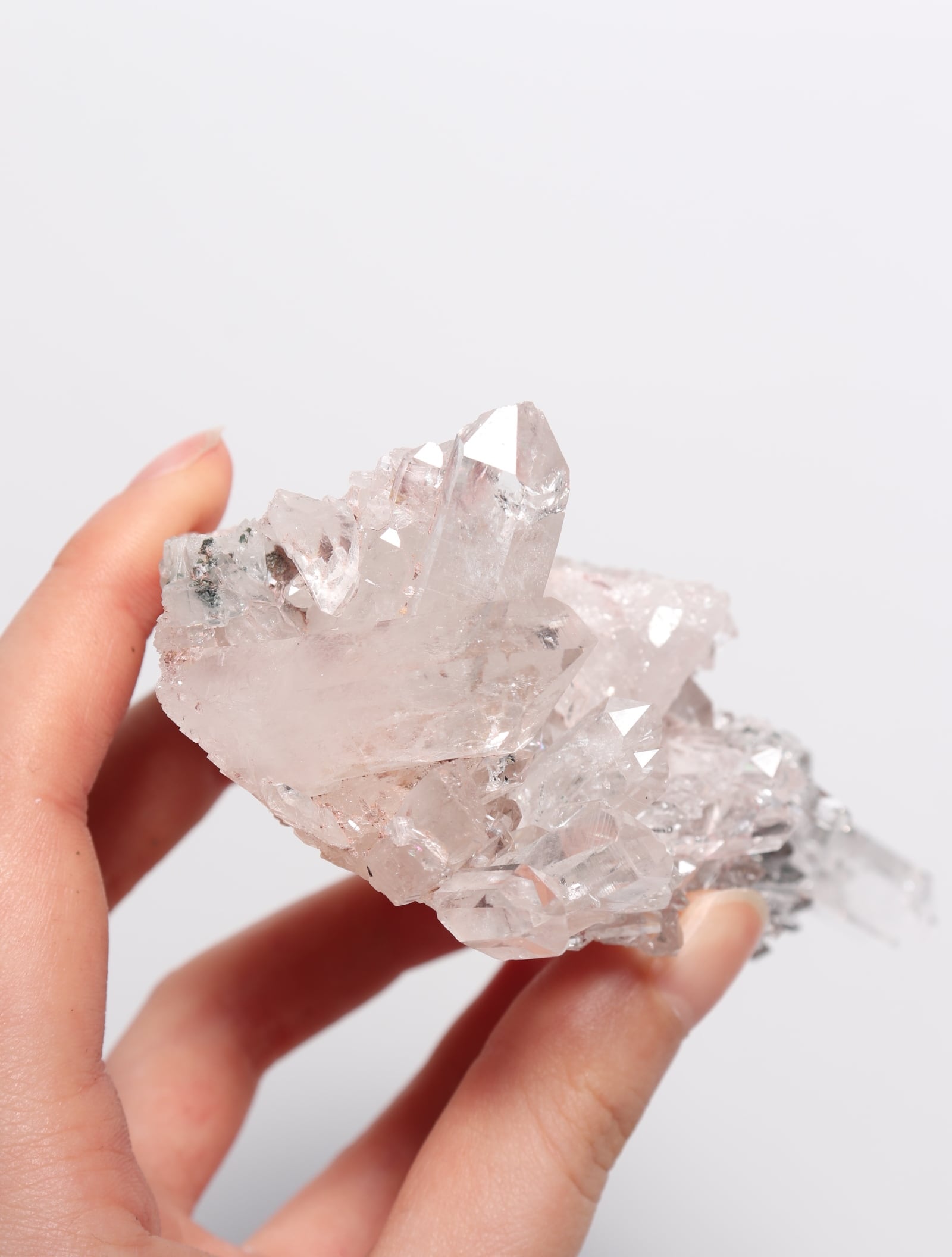 コロンビア産のクリスタルの多くはしっとりと艶やかな光沢とキラキラと輝きながら、「レムリアンレッジ」と呼ばれるバーコードのような成長ラインがほとんどの結晶の側面にビッシリと刻み込まれています。そして息を呑むほど美しく柔らかいピンクに発色する理由は、水晶の中に含むリチウムという元素らしいです。