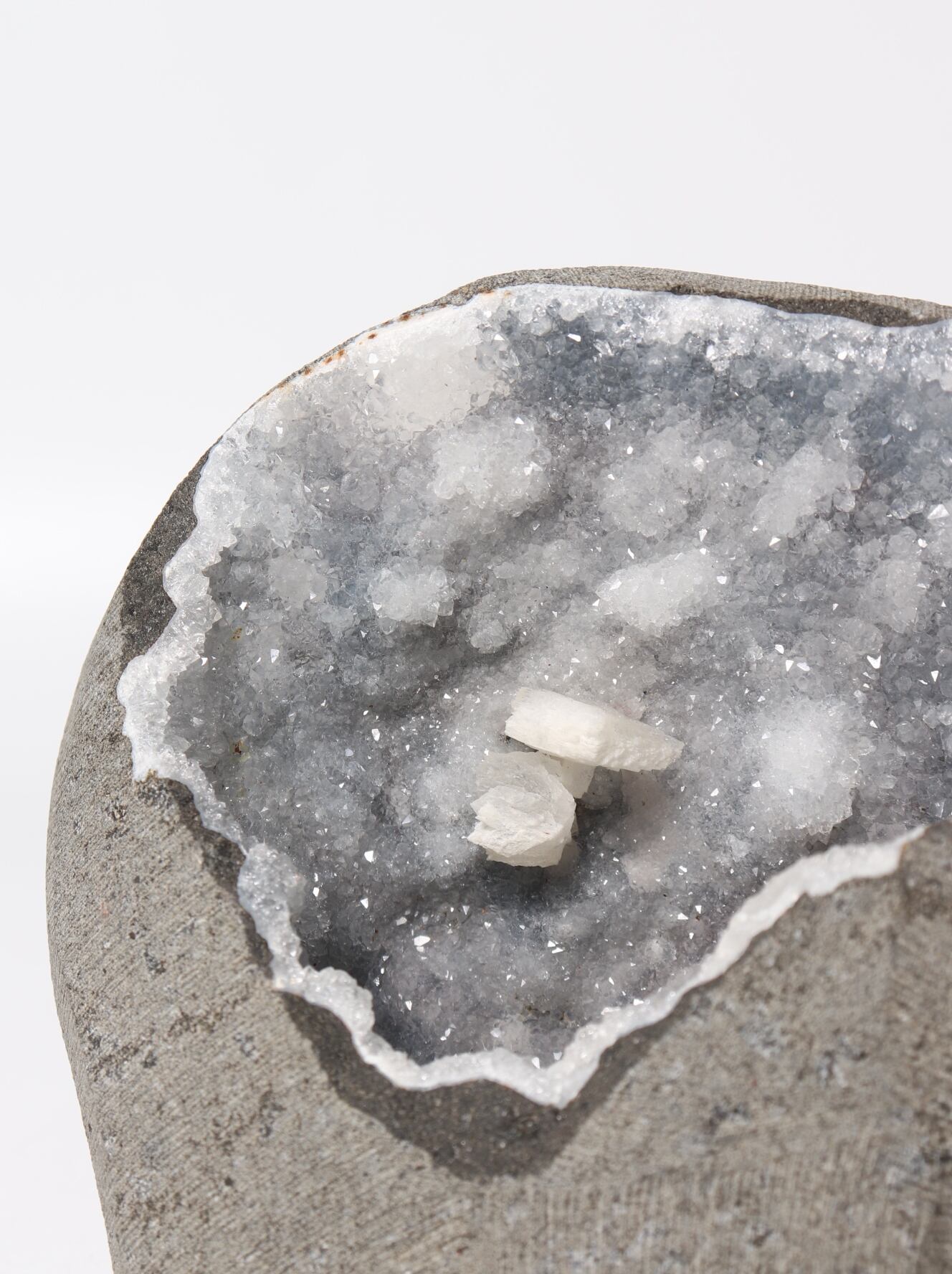 スモーキーブルーのカルセドニー上に、白いスティルバイトがぽつんと現れるキュートな鉱石。砂糖のような細かい結晶がキラキラ輝き、ころんとした可愛らしいサイズなのでインテリアとしてもおすすめ。