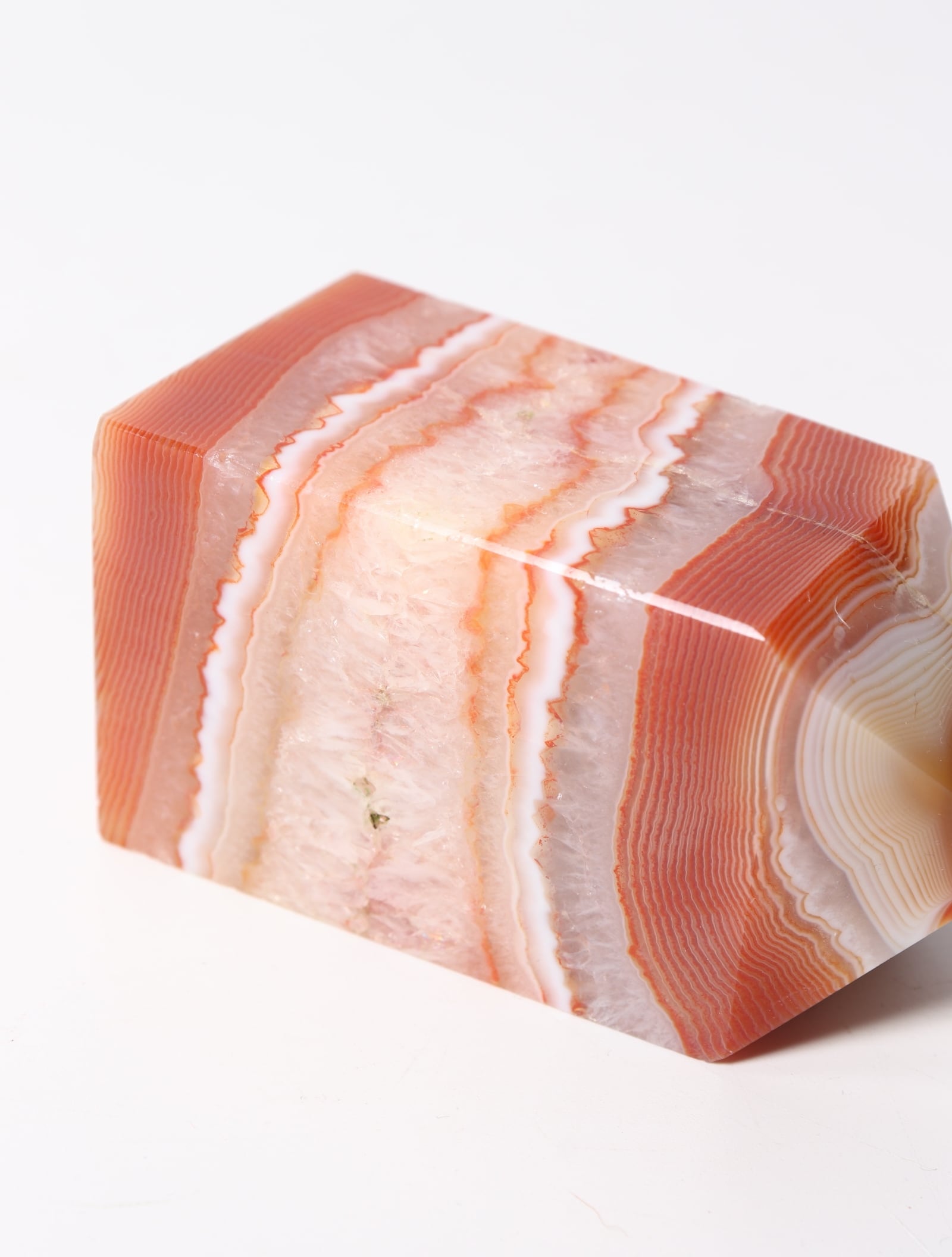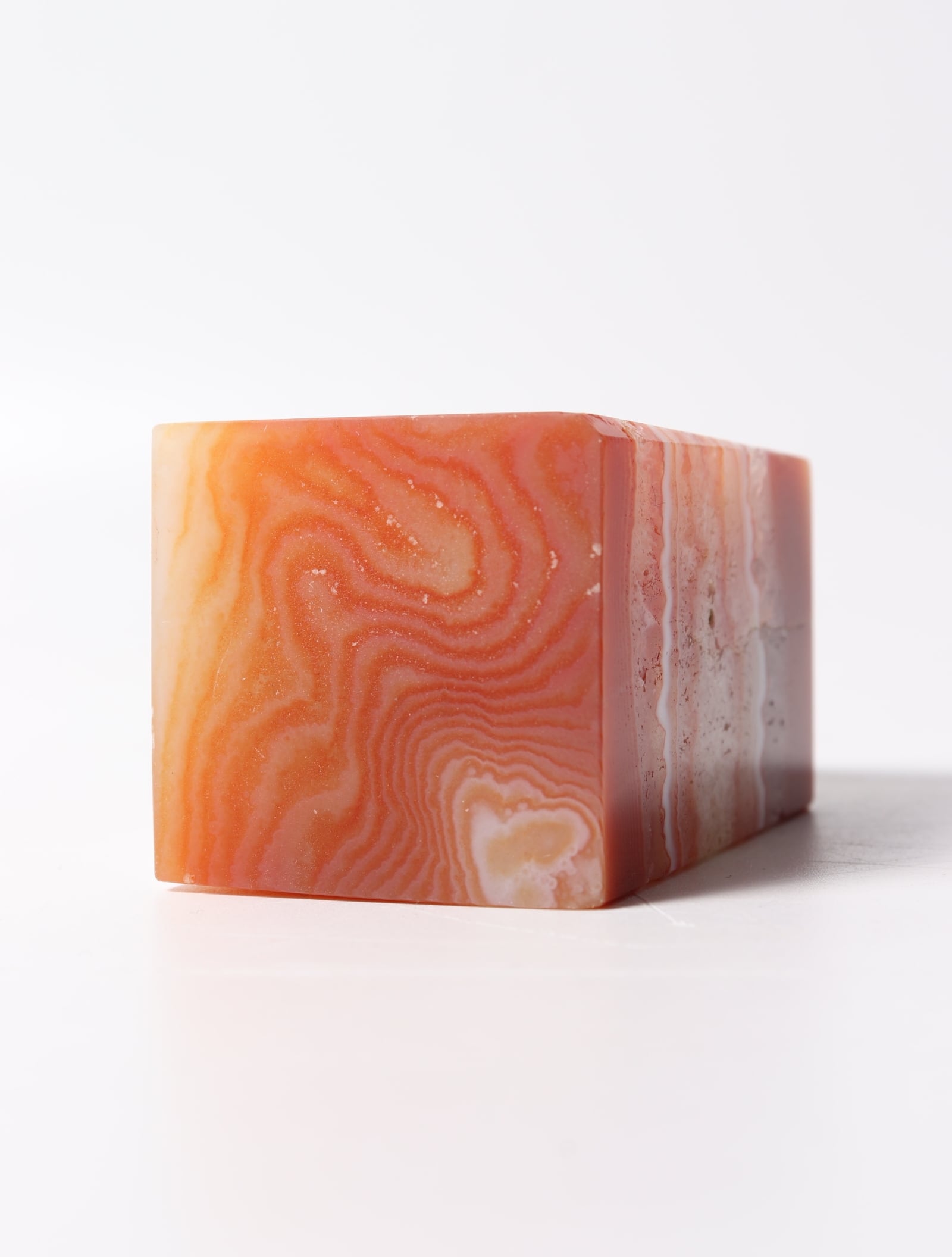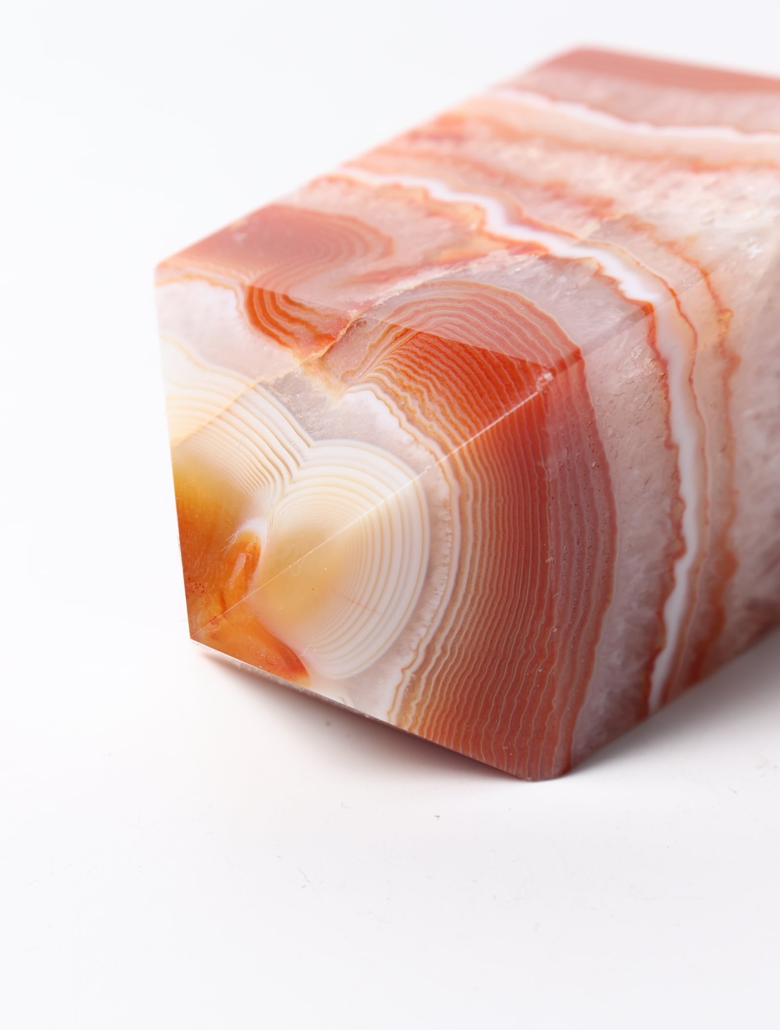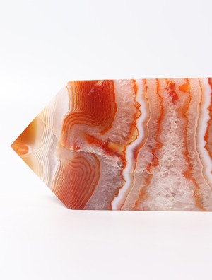 温かみのある色合いと非常に細かく柔らかい雰囲気を持つ縞模様が人気を呼び、カーネリアアゲートはジュエリーやアクセサリーとしてもよく用じられている天然石。