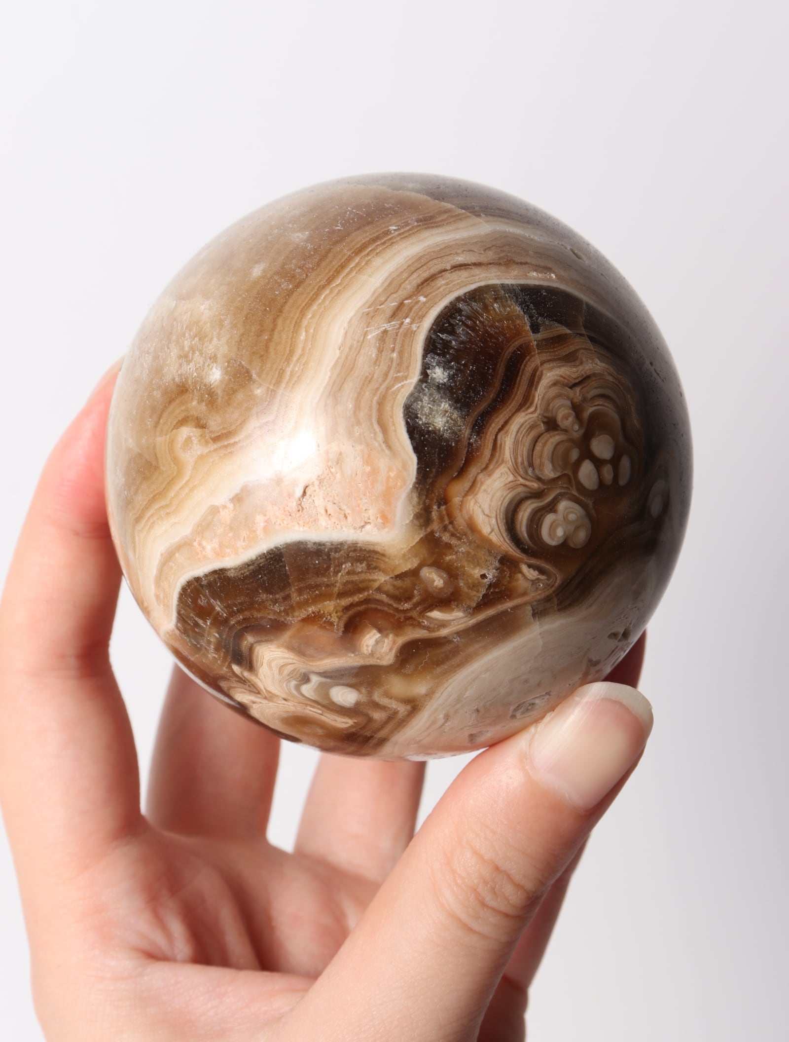 日本では「チョコレートカルサイト」と呼ばれることが多く、コーヒーにクリームを注ぐ瞬間のような美しい模様を創り出しています。その流動的な曲線が球体にとどまったとき、まるで小さな木星にも見えます。とても幻想的です。