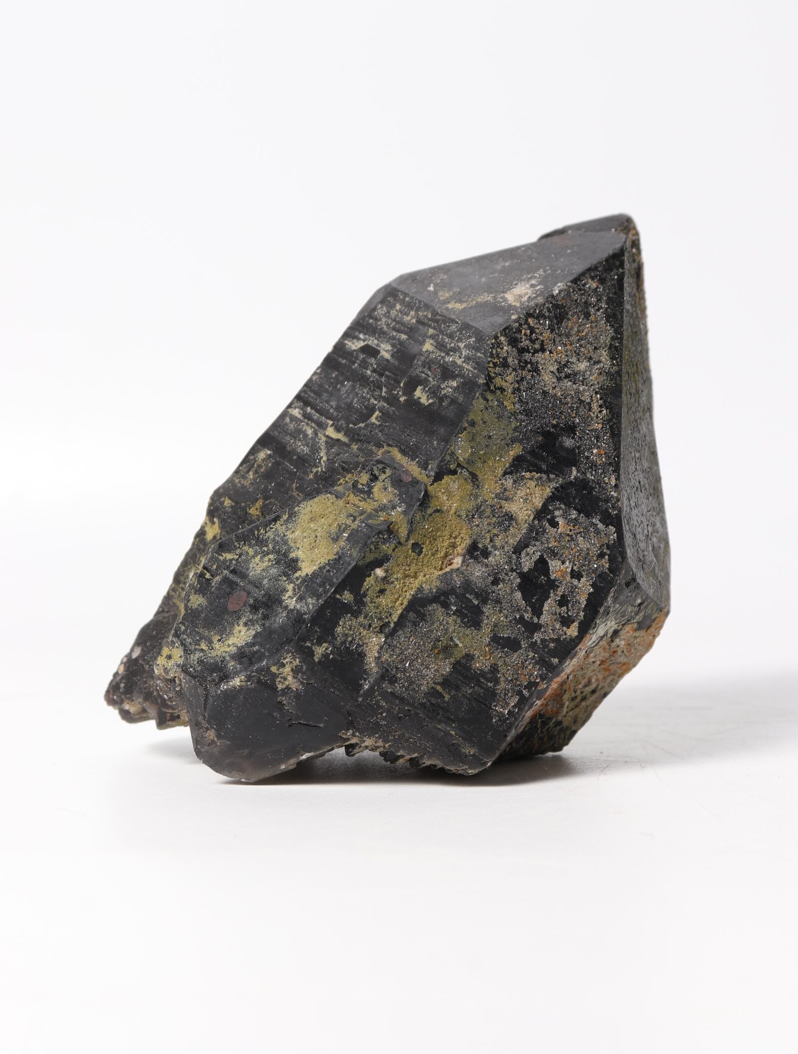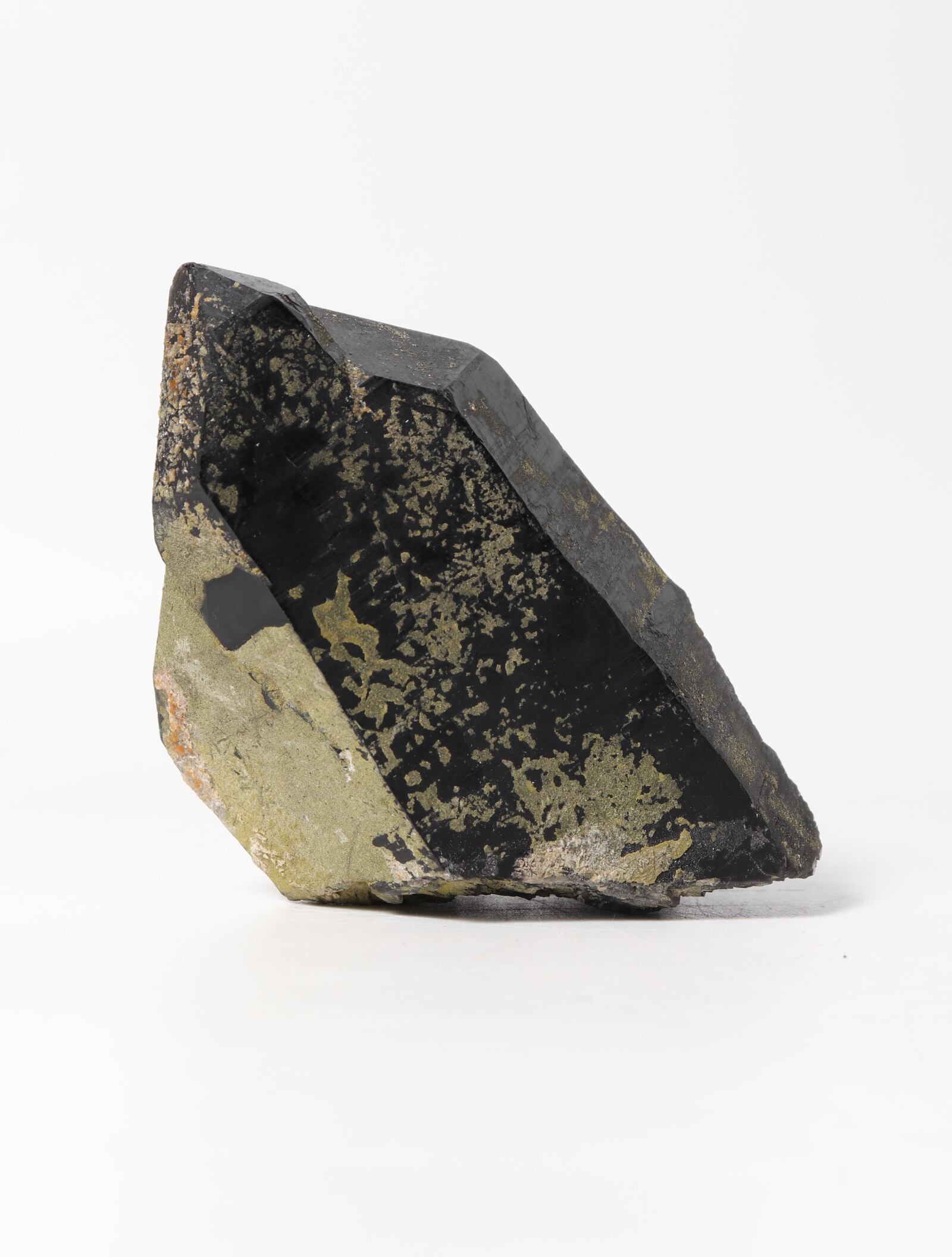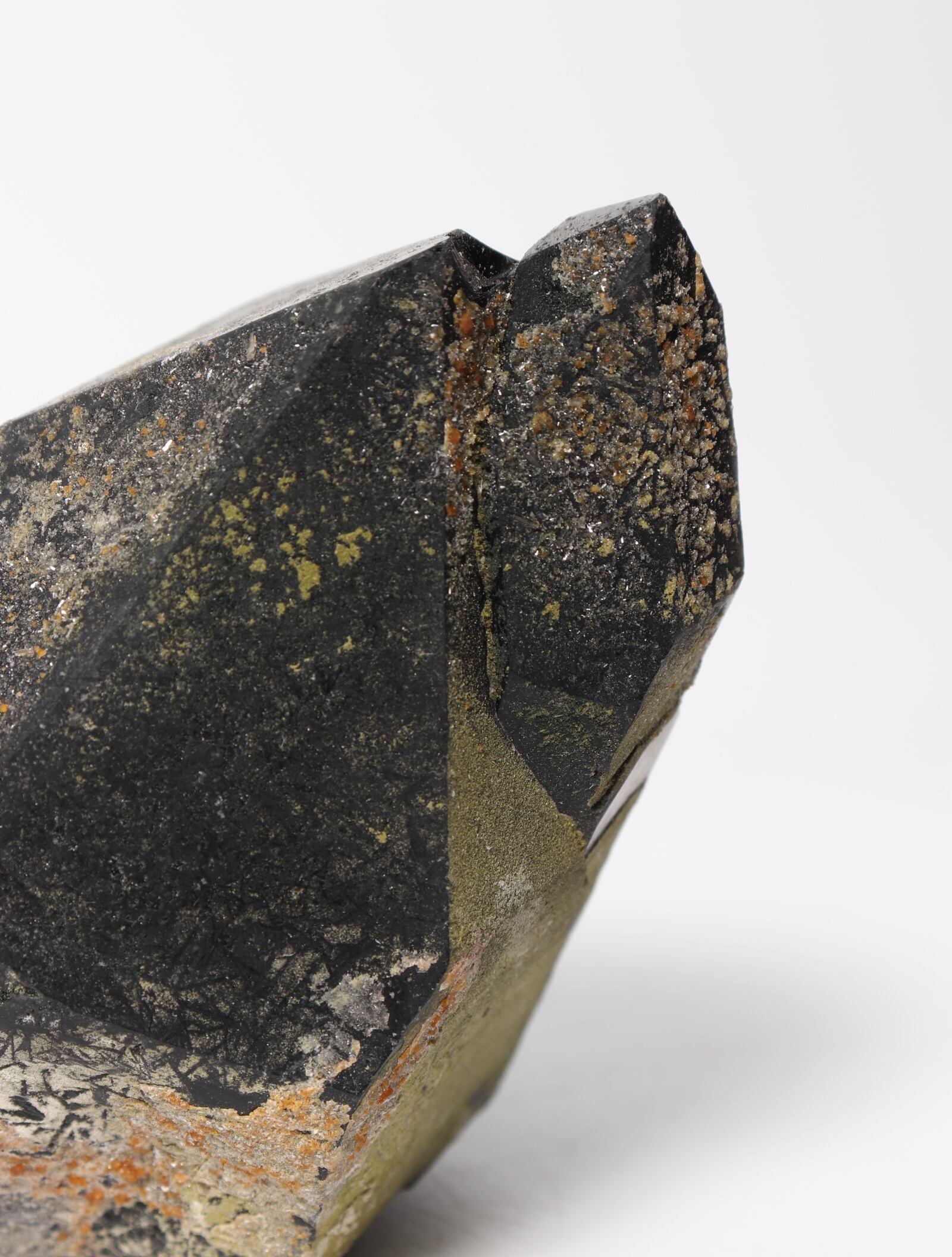こちらは緑簾石(緑の部分)と柘榴石(所々の緑簾石に付着しているオレンジ色の粒)と思われる鉱物が表面に共生しています。トップの反対がに自らを修復しているといわれるセルフフィールドが見られ、小さな結晶がたくさんくっついてる箇所があります。欠けが1箇所もなく、形がとても綺麗に保たれたレアな一点です。