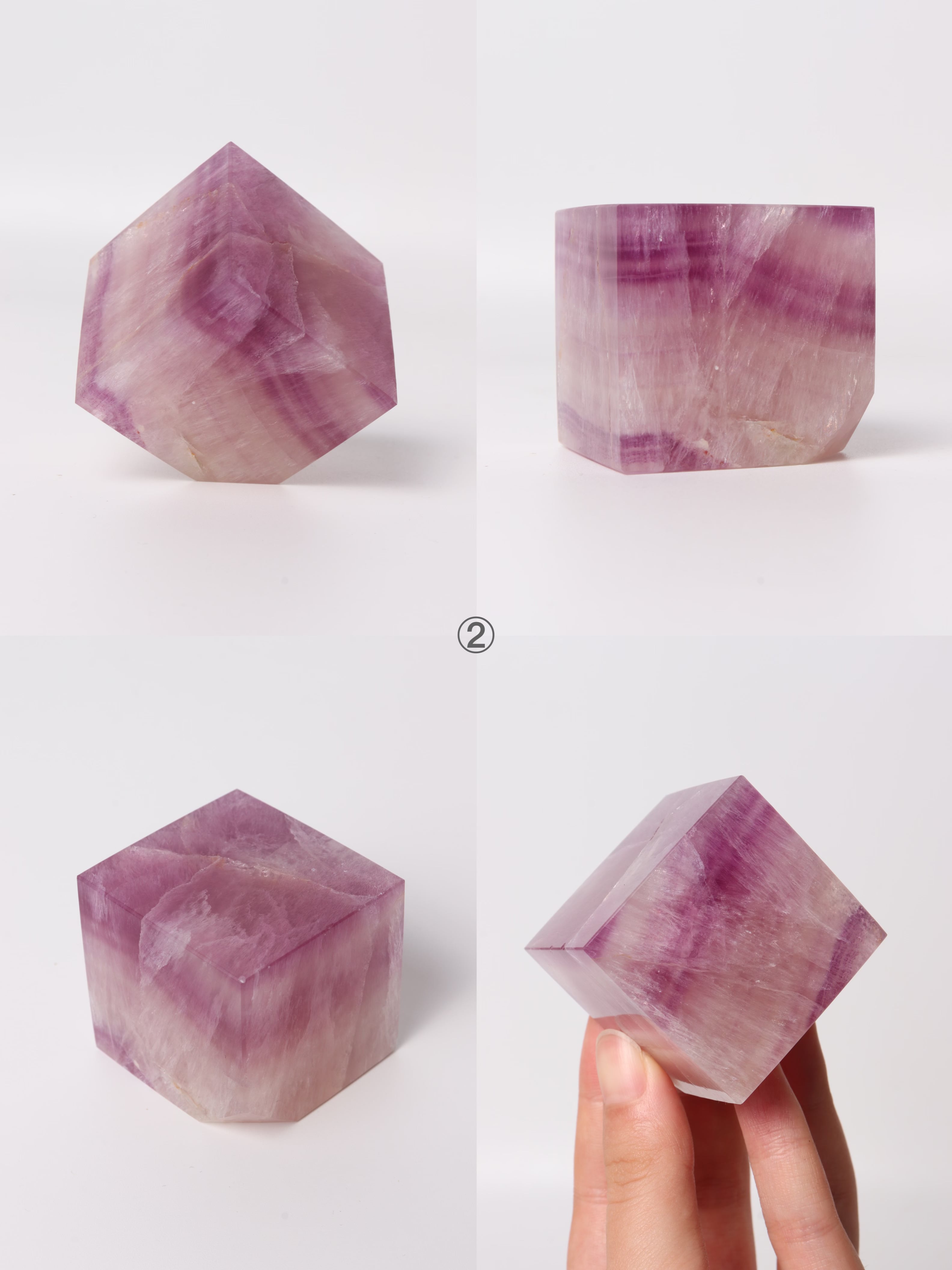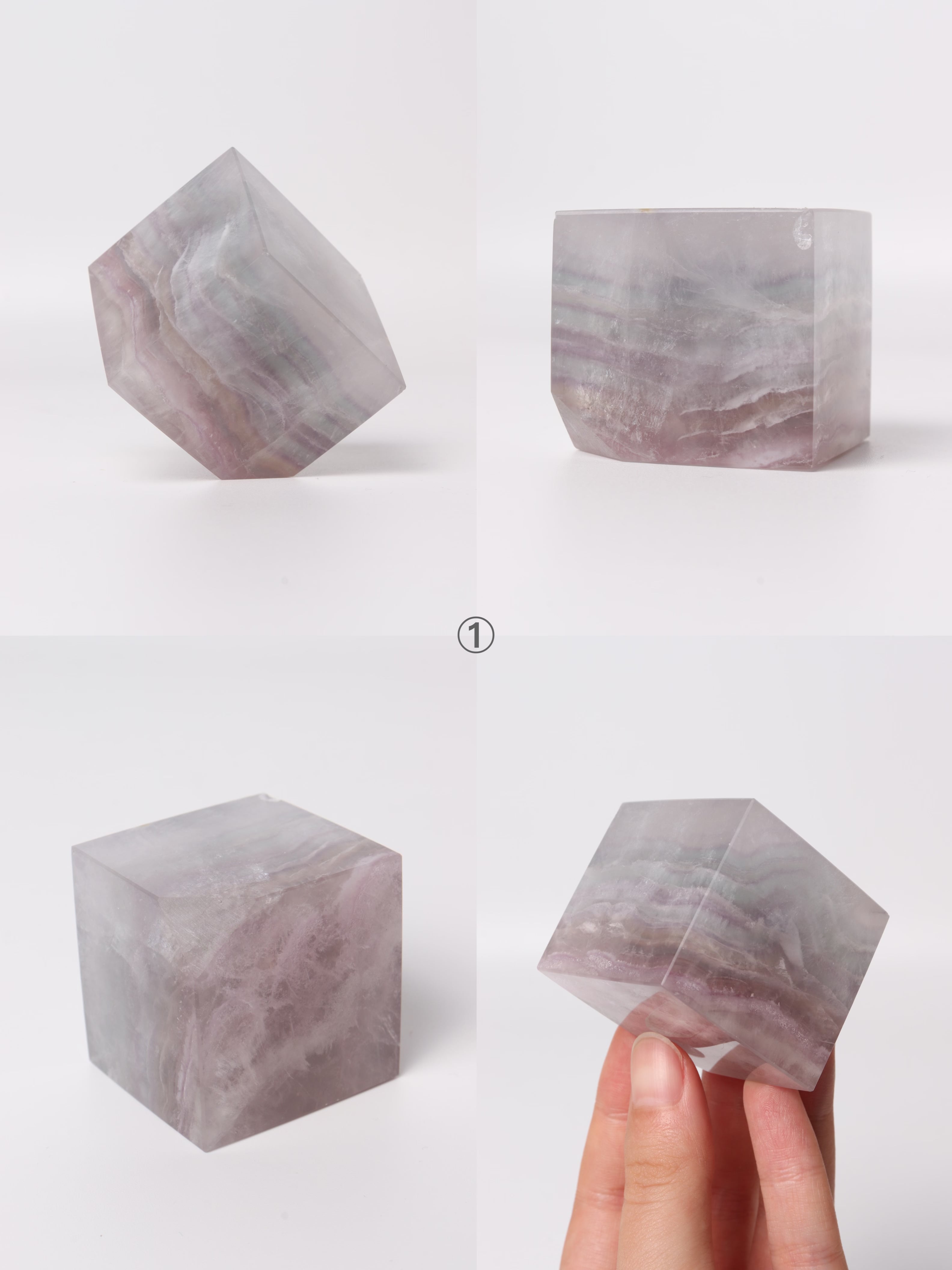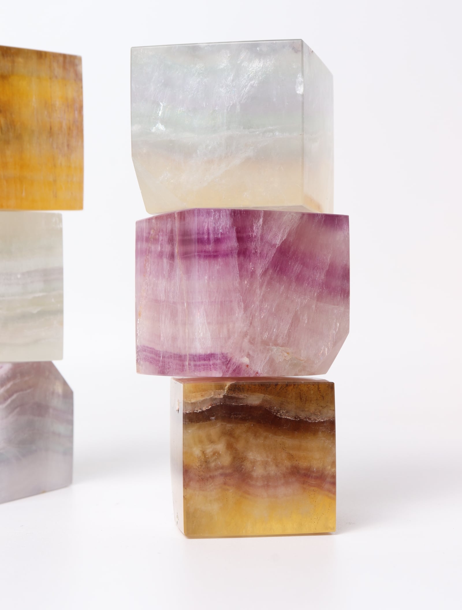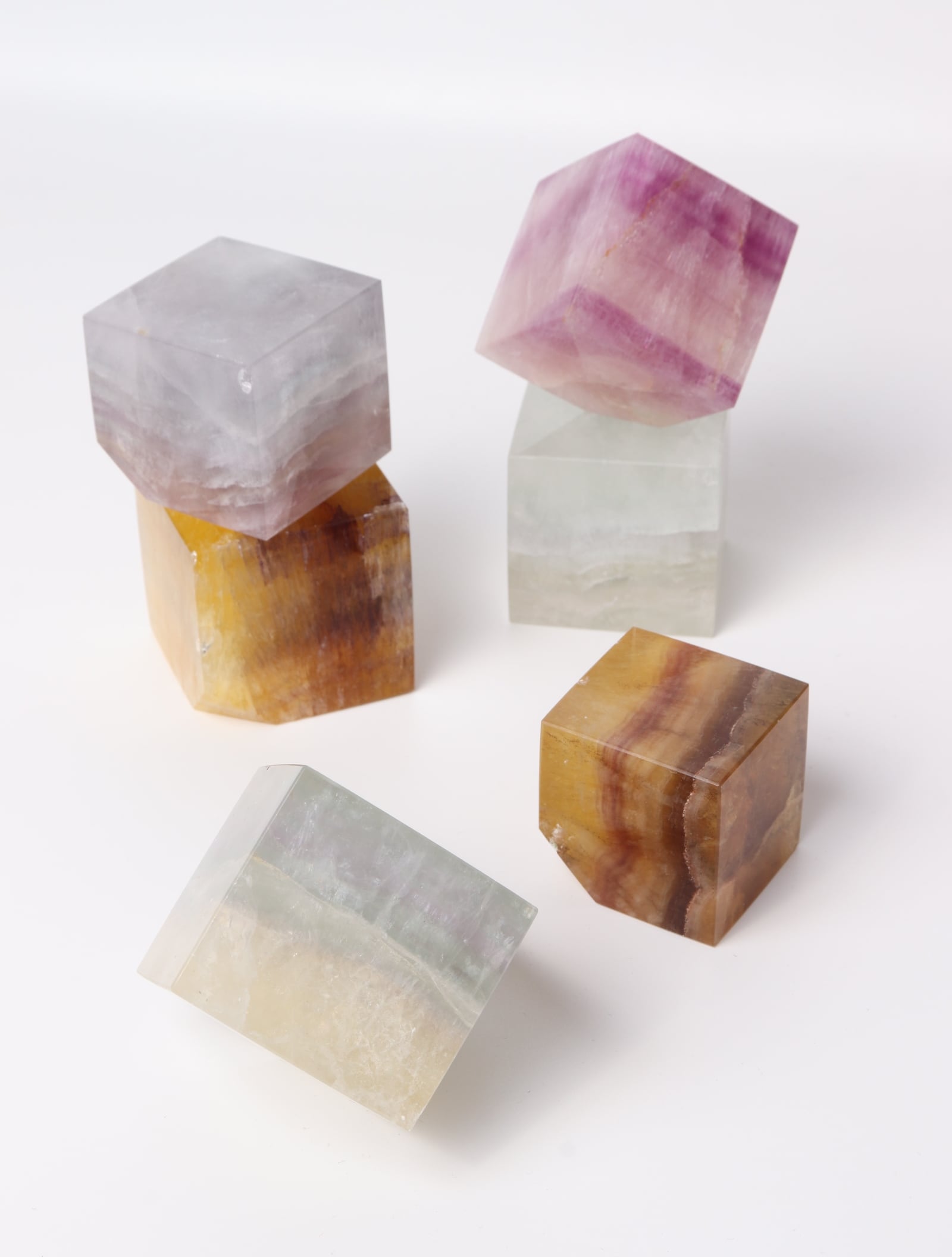 カラーバリエーションが豊富で、キューブの形に整えられたフローライトの飾り物。
