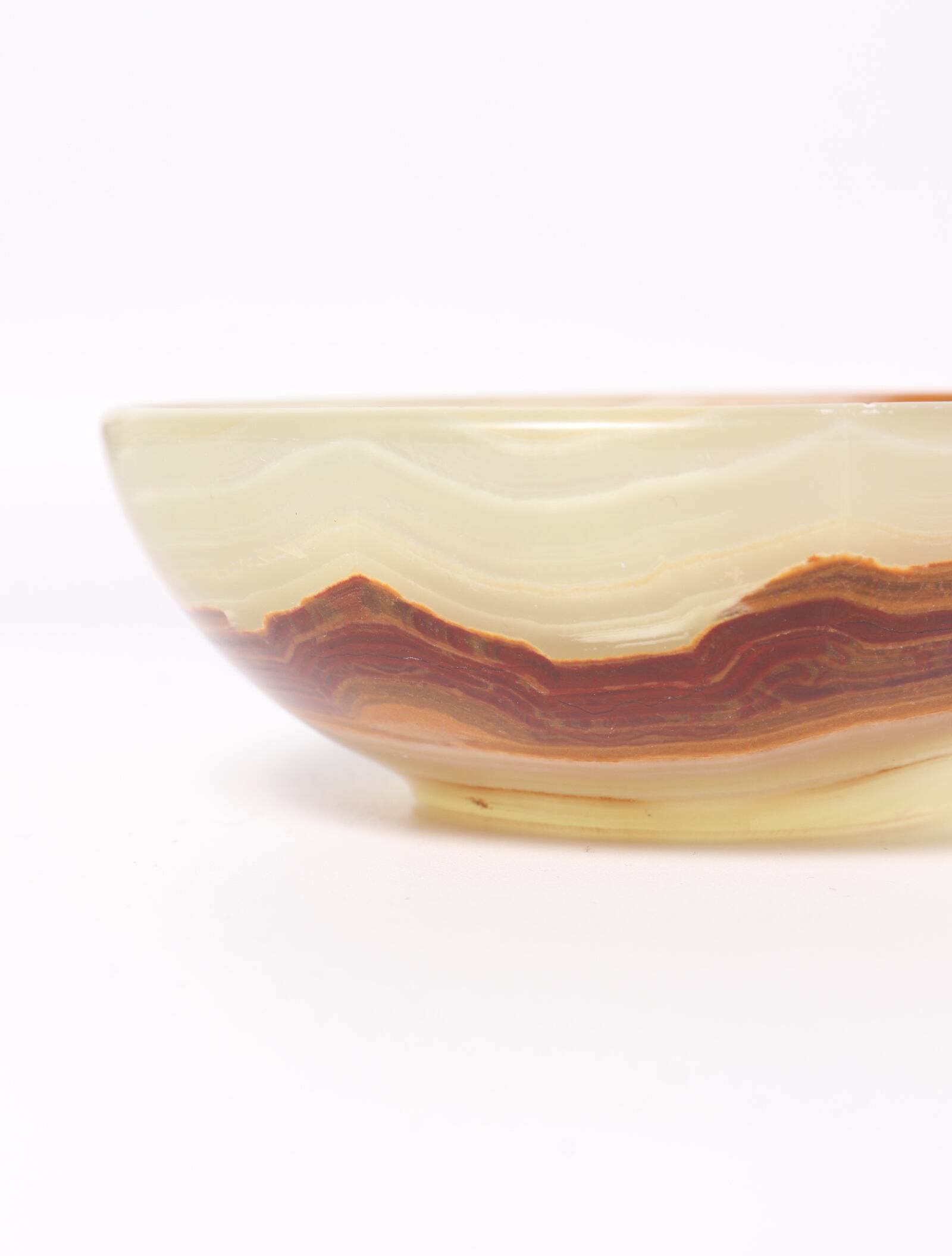 柔らかく光を通す、半透明の石材「オニキス」そのものの素材感を生かしたシンプルなボウル。「オニキス」は癒し、成長、物質的な豊かさと成功をもたらす石と言われています。半透明の石なので、光に照らすと様々な色調を見せてくれます。割れにくいよう適度な厚みを持たせて、とてもきれいに仕上げています。