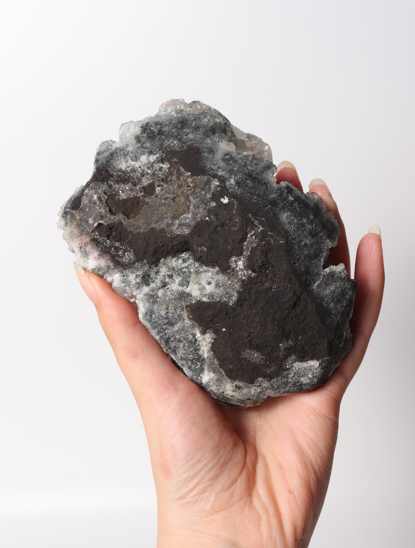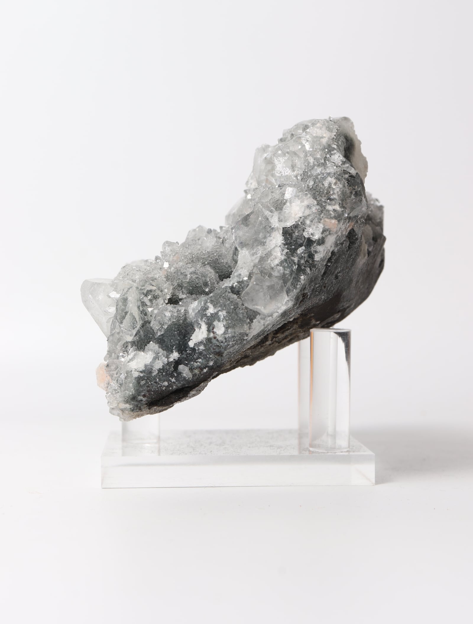 モコモコとしたグレー色のカルセドニーに、ダイヤモンドアポフィライトが小さな結晶し、たくさんくっついてます。その間に柔らかい薄ピンク色のスティルバイト所々に形成されています。