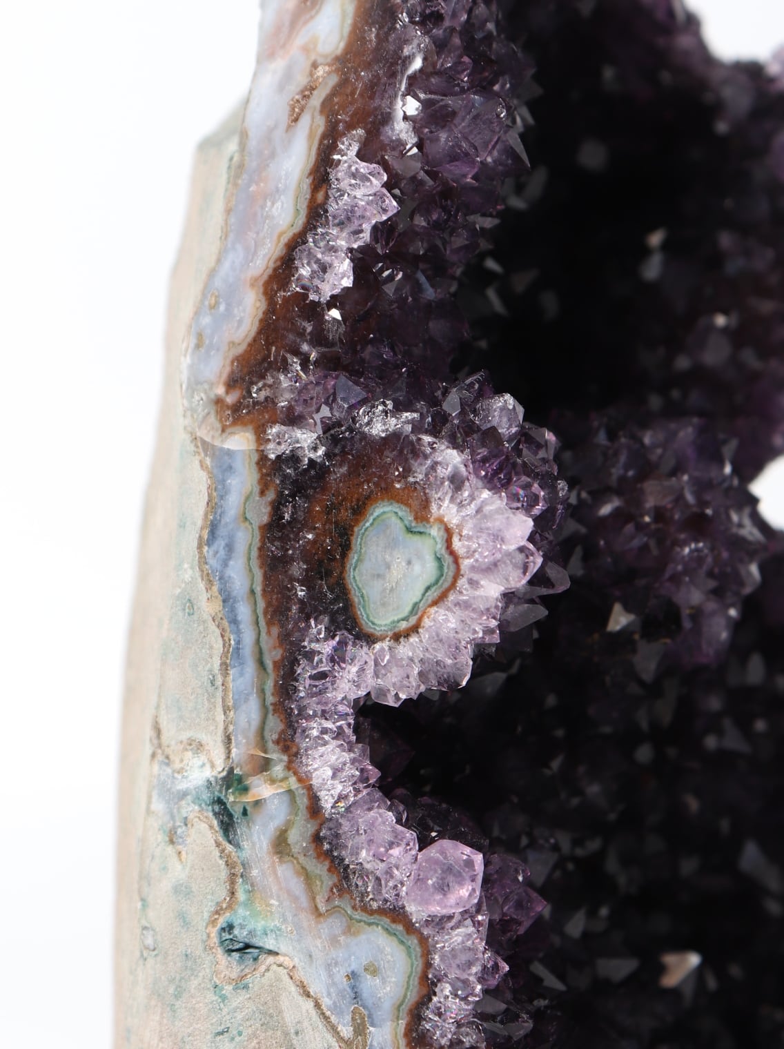 こちらには珍しいスタラクタイトが見られます。スタラクタイトとは、鍾乳状に生えたアメジストを輪切りした時にまるで花に見える模様のことです。さらに興味深い現象で、それぞれの錐面に指紋のような模様(最後の写真)も見られる優れた一点。