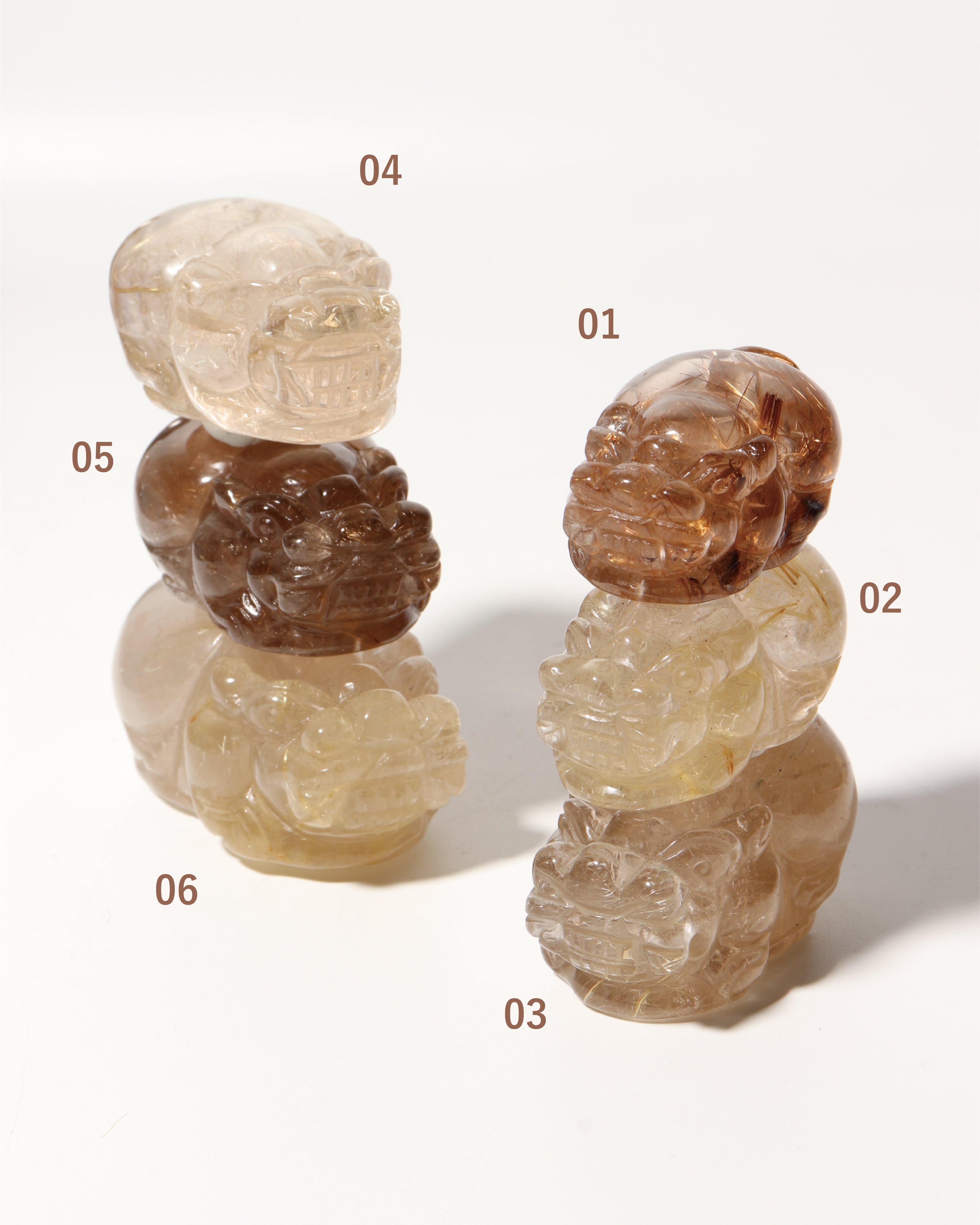 今の時代は技術が進み、器械による彫刻品もたくさん存在しています。今回セレクトした6個のヒキュウは職人が優れたルチルクォーツの原石を自ら選定し、手作業で彫られているため、それぞれの表情やフォルムも異なります。