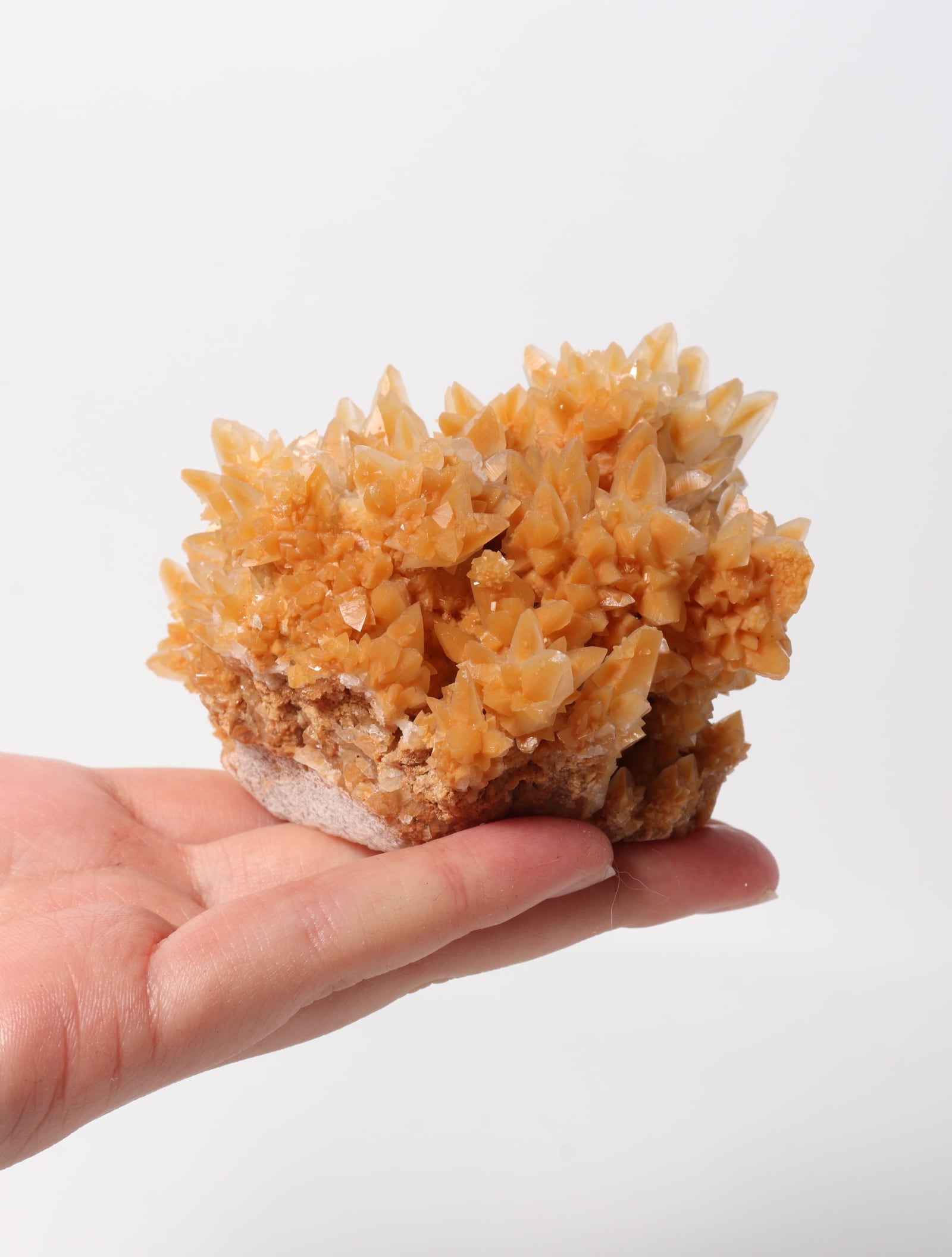 ドッグトゥース(犬歯)カルサイトとしても呼ばれる角錐形に成長したカルサイト結晶。四方に向かって花のような結晶が咲き、どの角度からも楽しめます。結晶のサイズは大小様々なので、先端が鋭利なものもございます。