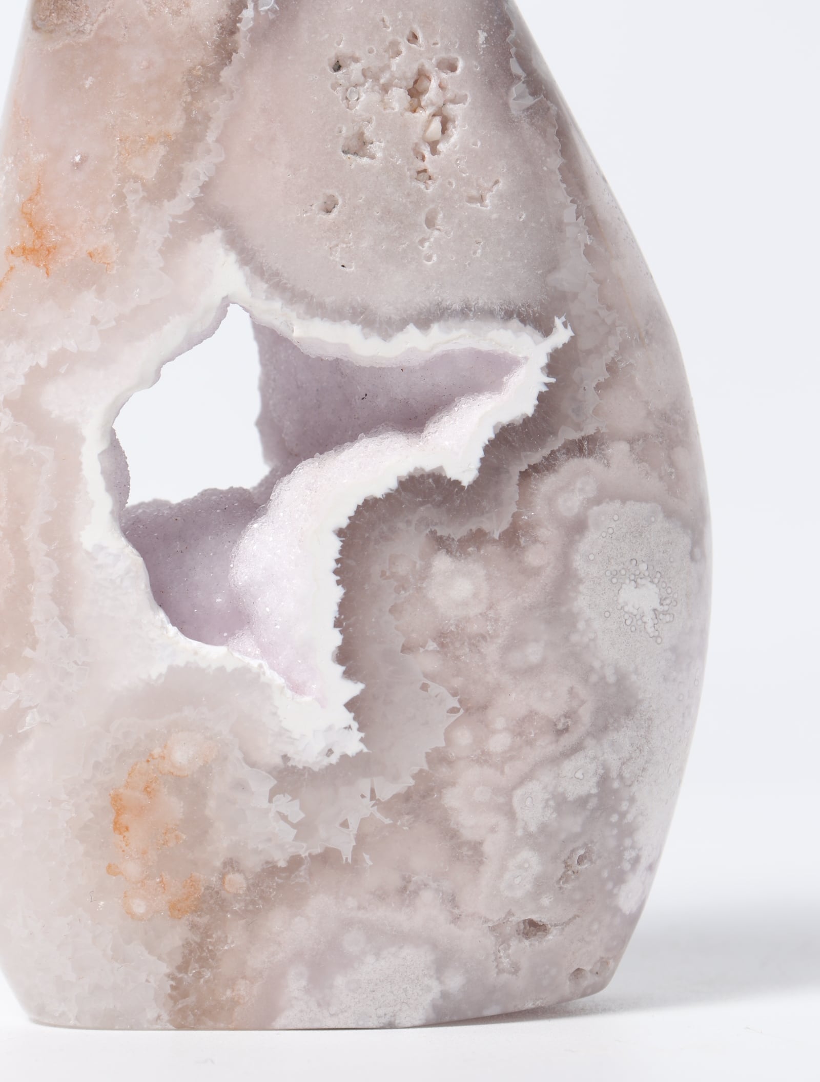 優しい色合いに桜の花のような結晶模様を持つ「フラワーアゲート」に、ドリーミィーな紫色が特徴の「ピンクアメジスト」と共生している一度目にしたら忘れられない魅惑の置物。