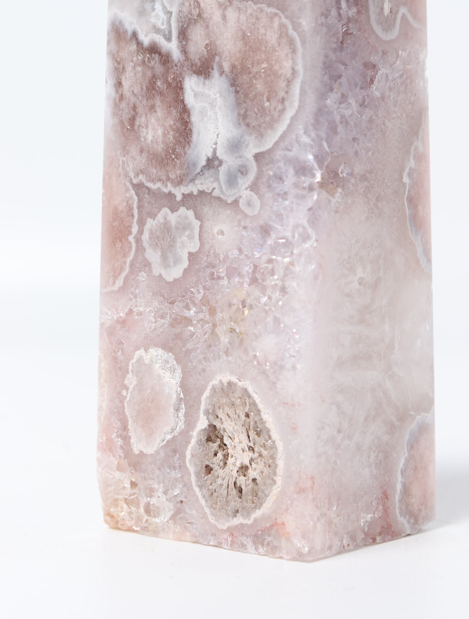 優しい色合いに桜の花のような結晶模様を持つ「フラワーアゲート」に、ドリーミィーな桃色が特徴の「ピンクアメジスト」と共生している一度目にしたら忘れられない魅惑のタワー。