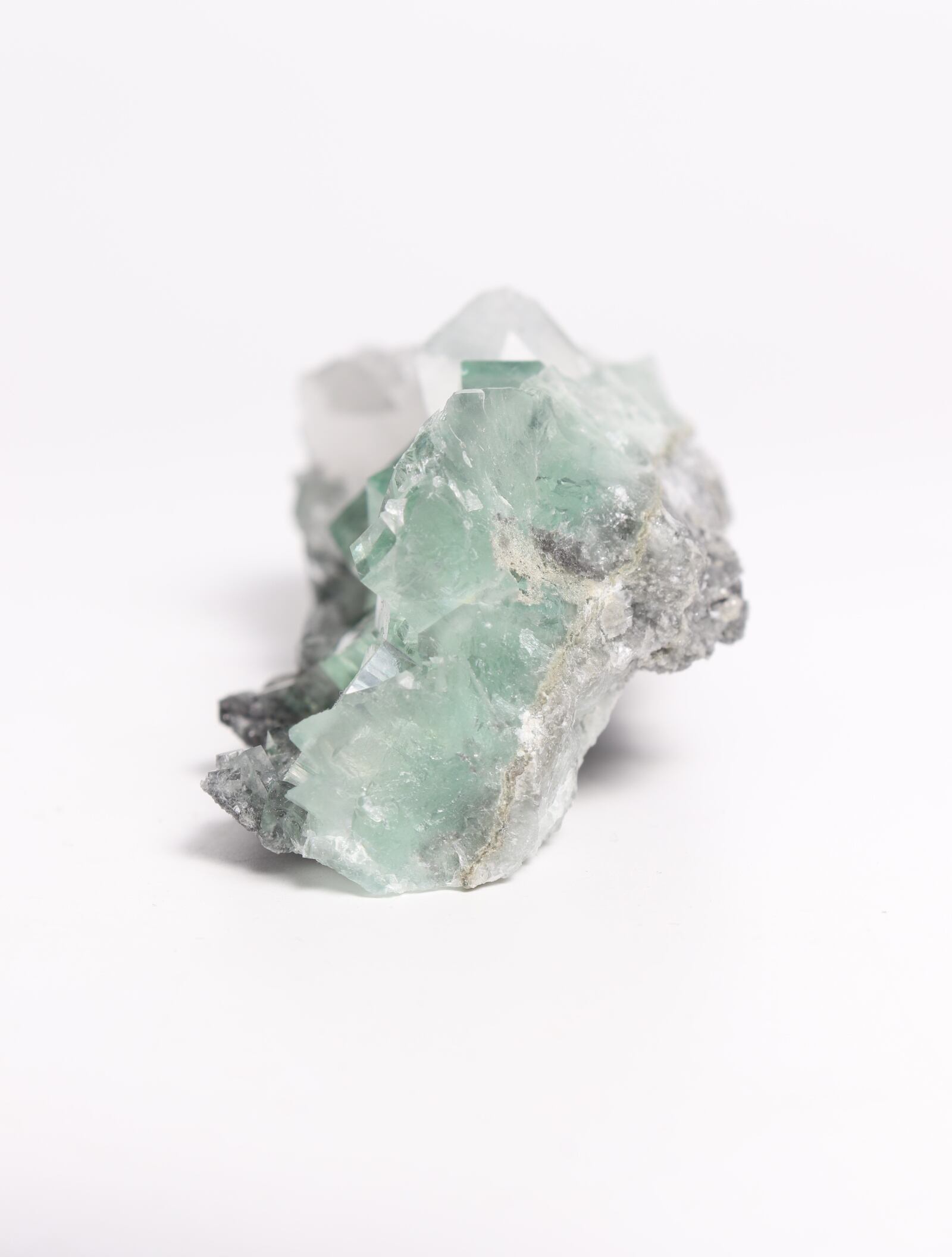 抜群の透明感を持つグリーンフローライトの結晶と板状カルサイトの群晶が大変美しく、エメラルドグリーンのような上品な発色はインテリアストーンとしても素敵だと思います◎